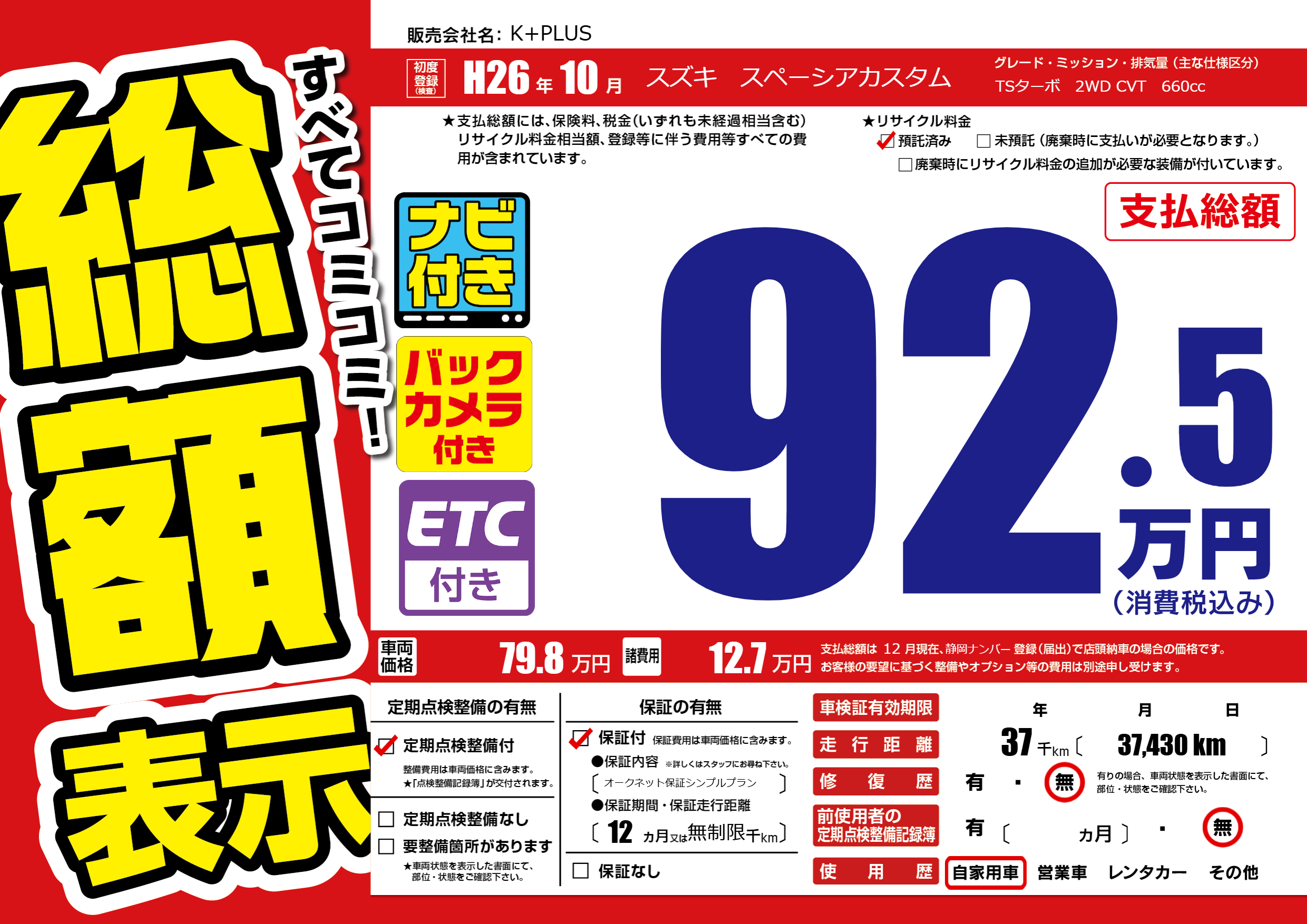 | 走行キロ | 3.7万km | 初年度登録 | H26年10月 |