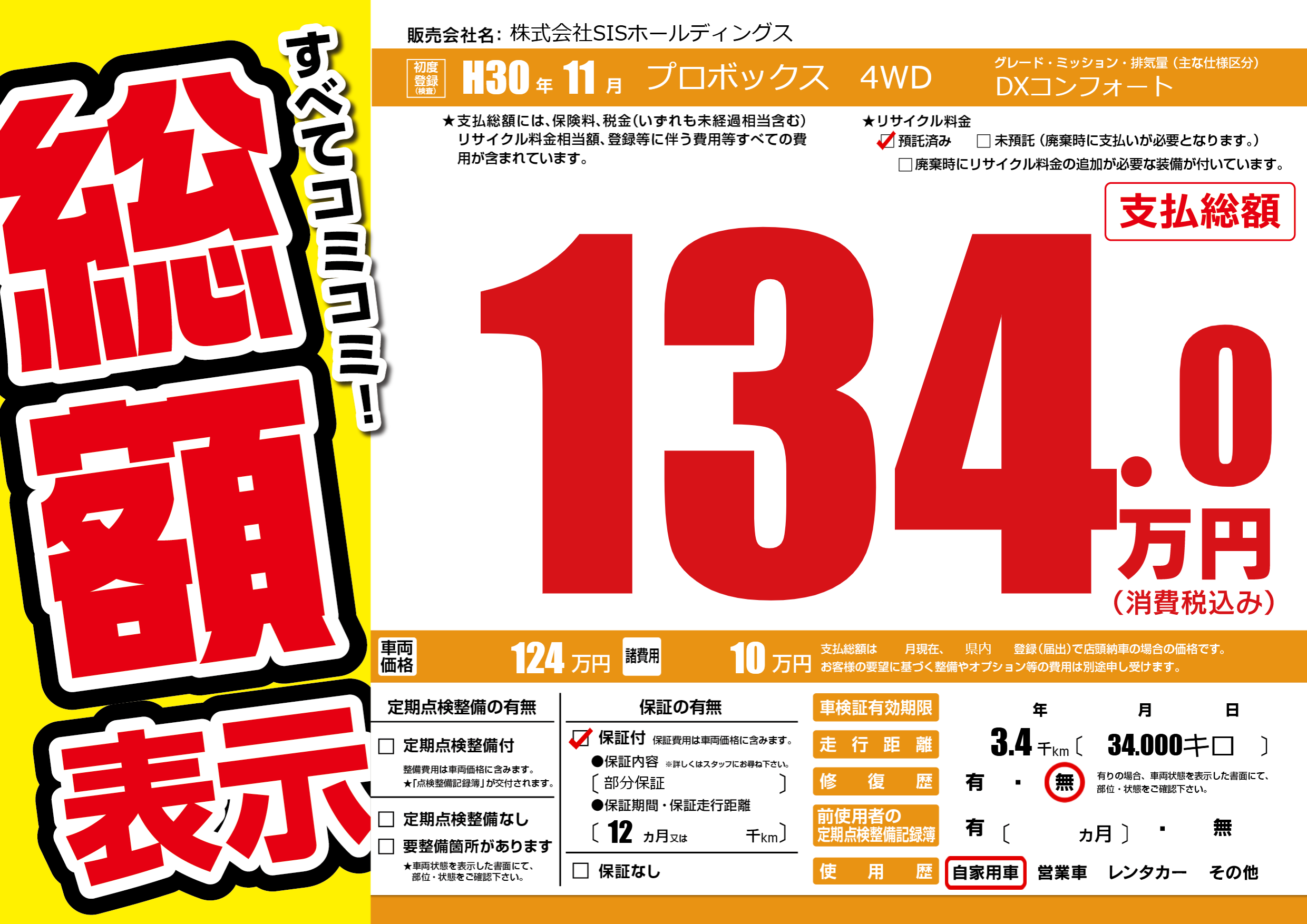 | 車名 | プロボックス 4WD | グレード ミッション 排気量 |