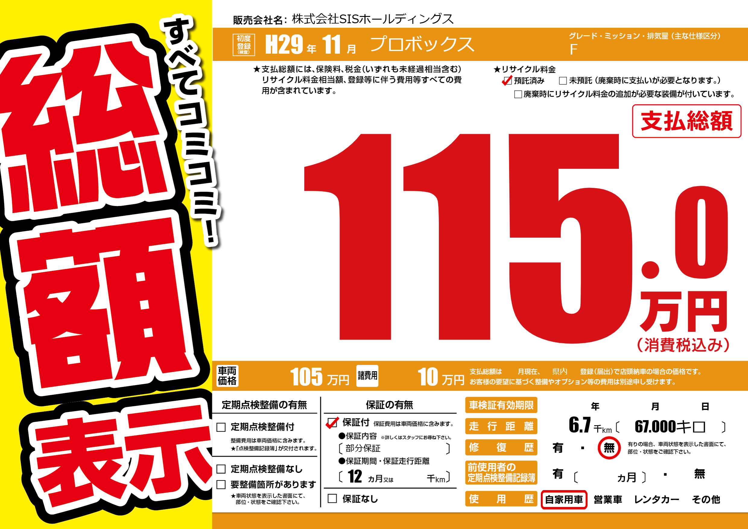 | 車名 | プロボックス | グレード ミッション 排気量 |