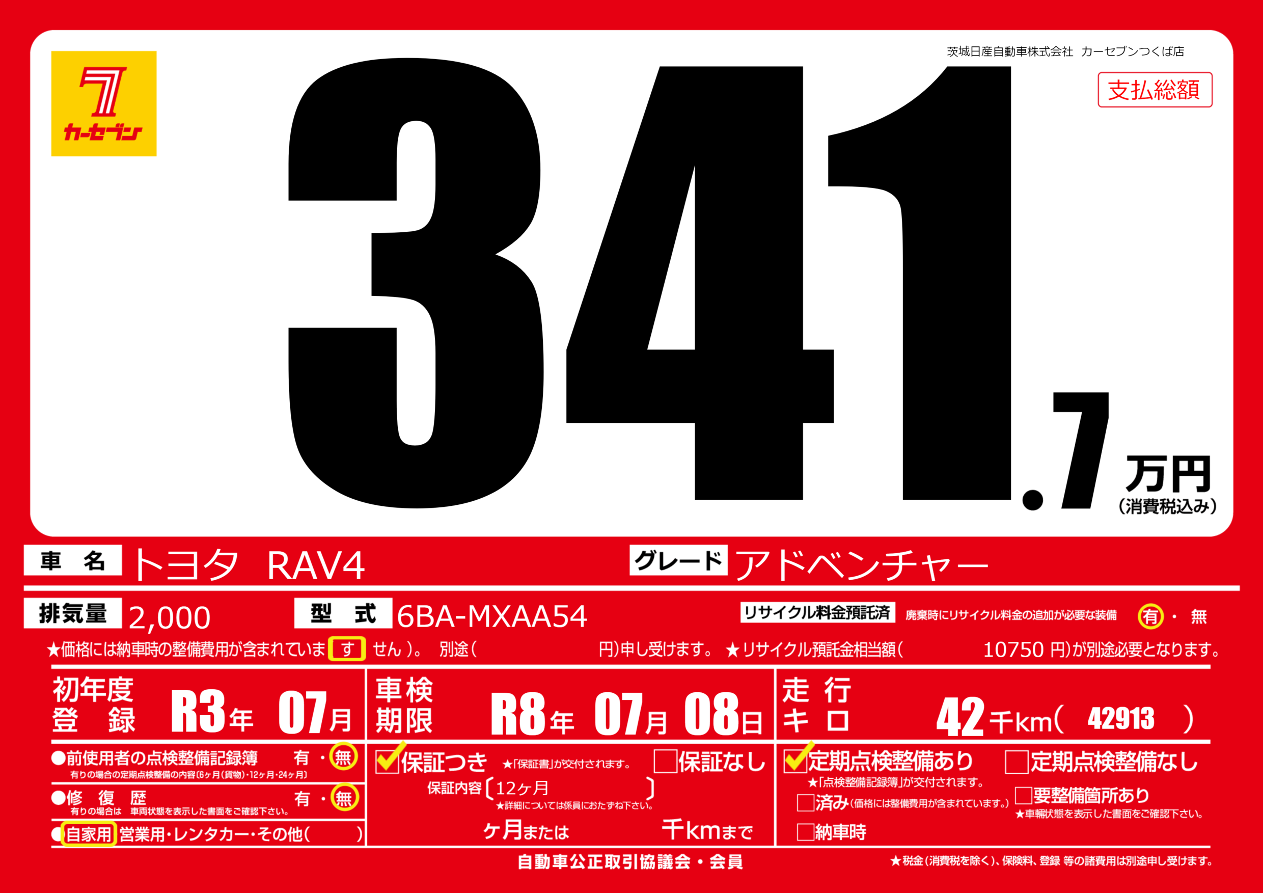 | 車名 | トヨタ RAV4 | グレード ミッション 排気量 |