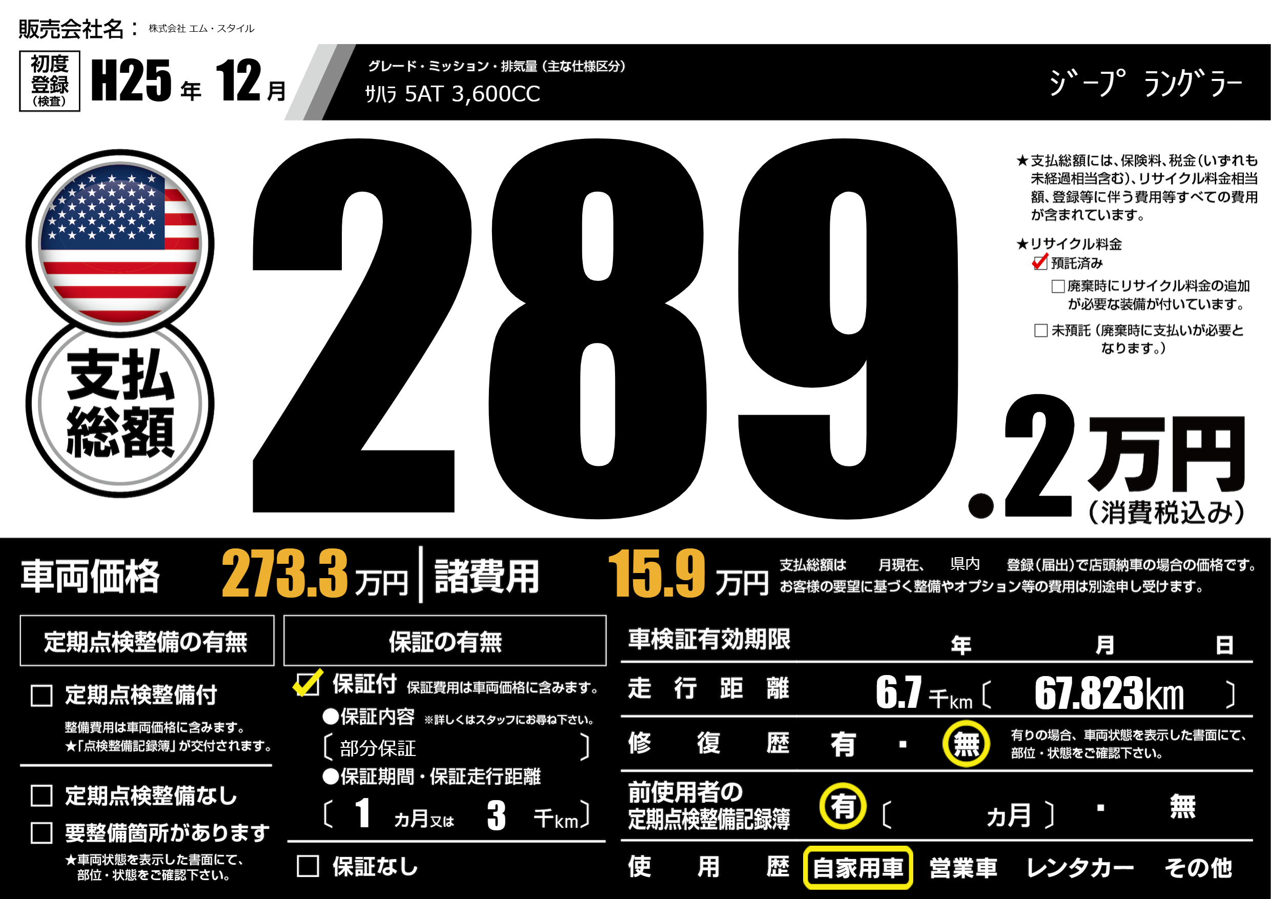 | 車名 | ジープ ラングラー | グレード ミッション 排気量 |