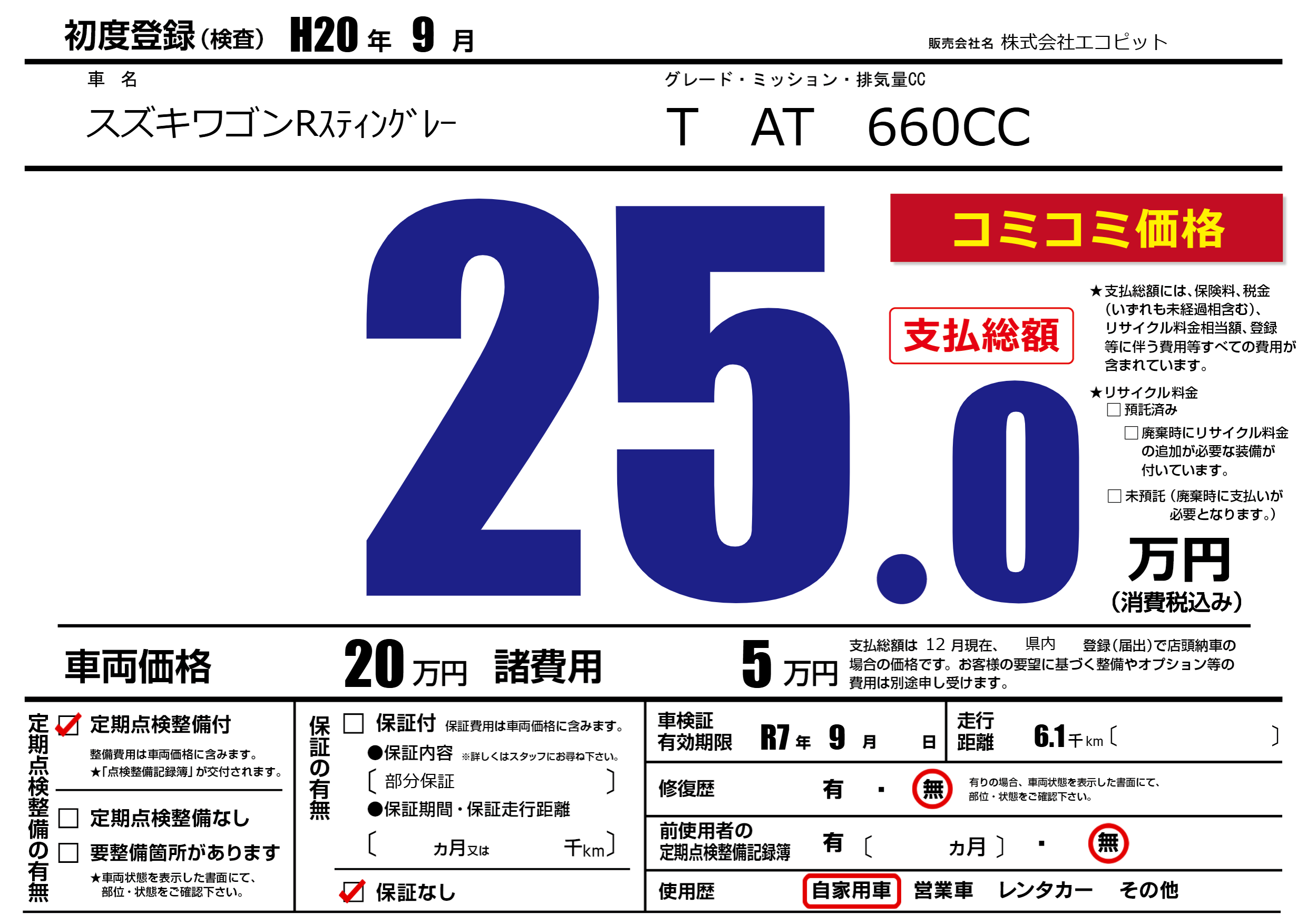 | 車検制限 | R7年 9月 - 日 | ||
