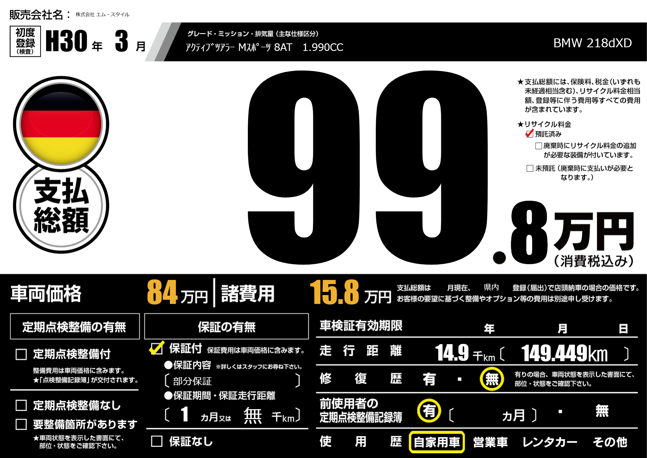 保証付き 保証内容(部分保証) 1ヶ月または(無)千kmまで |