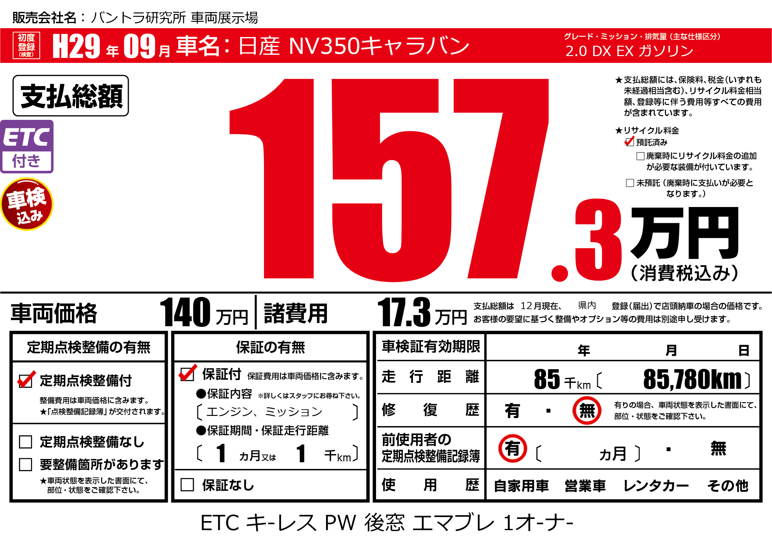 | 車名 | 日産 NV350キャラバン | グレード ミッション 排気量 |