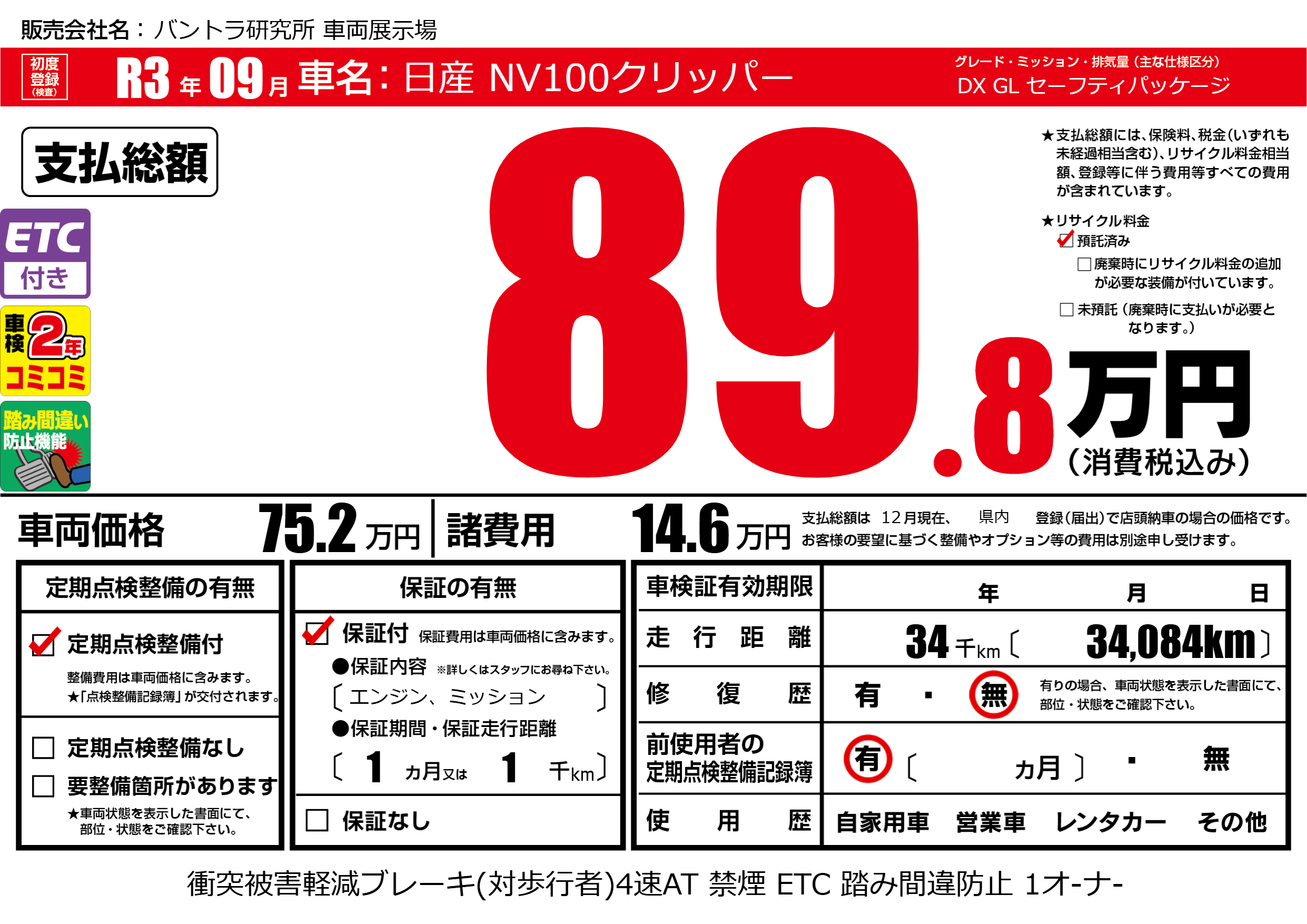 | 車名 | 日産 NV100クリッパー | グレード ミッション 排気量 |