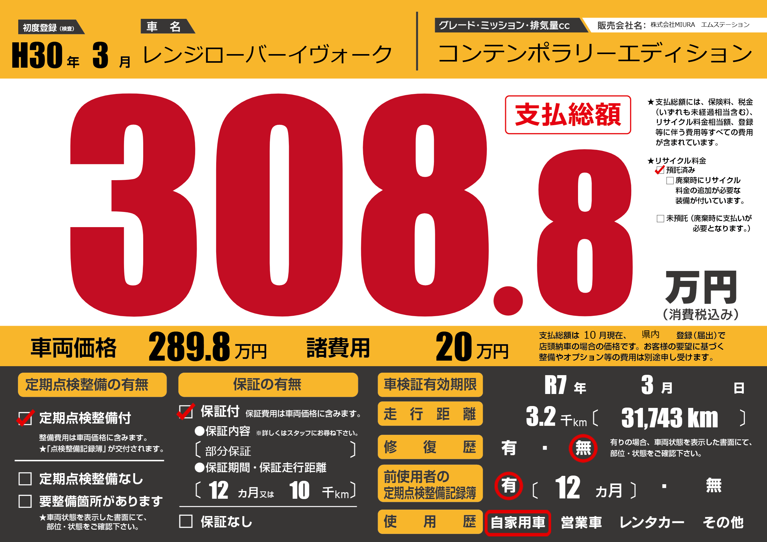 | 走行キロ | 0.3万km | 初年度登録 | H30年3月 |