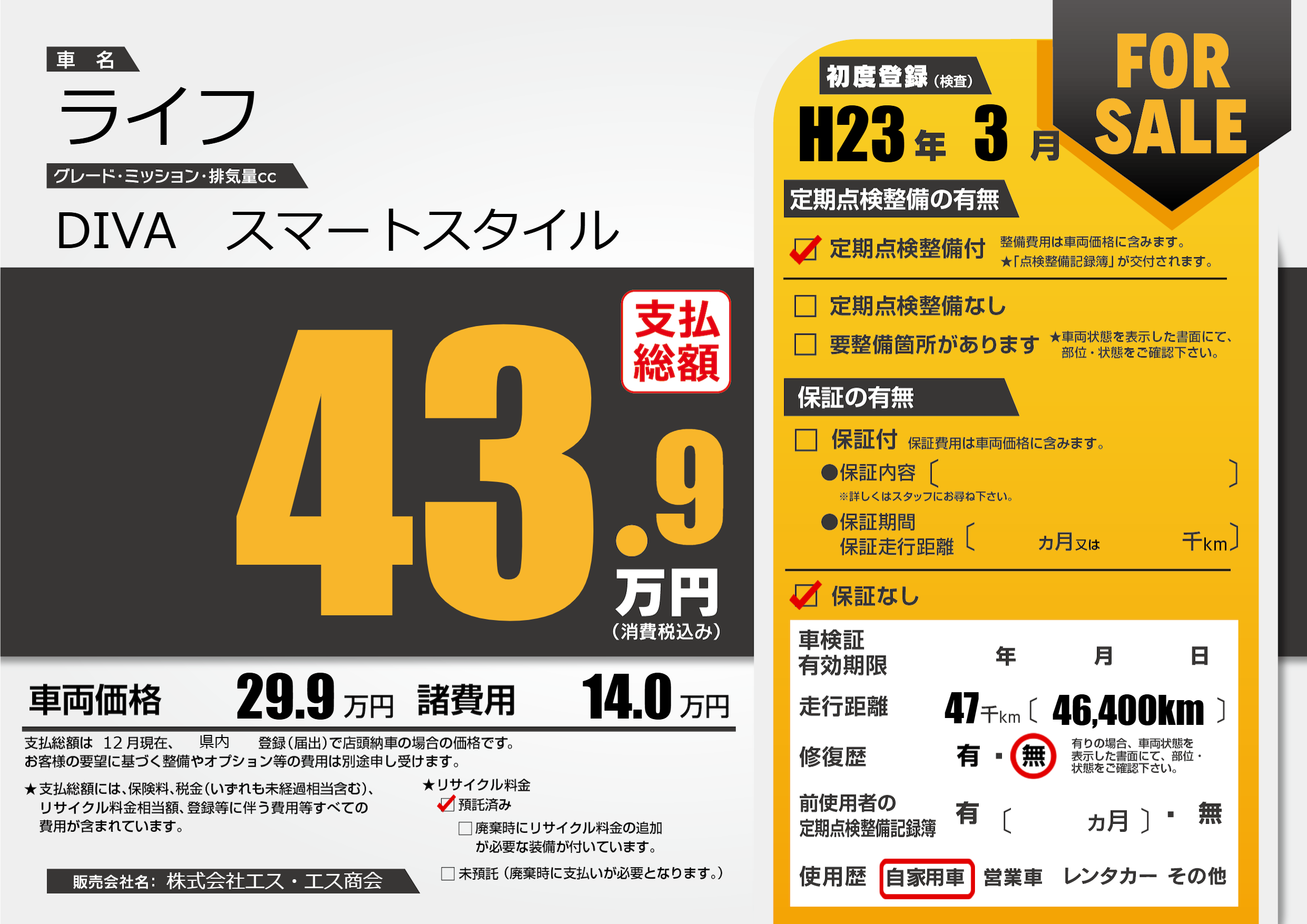 | 走行キロ | 4.7万km | 初年度登録 | H23年3月 |
