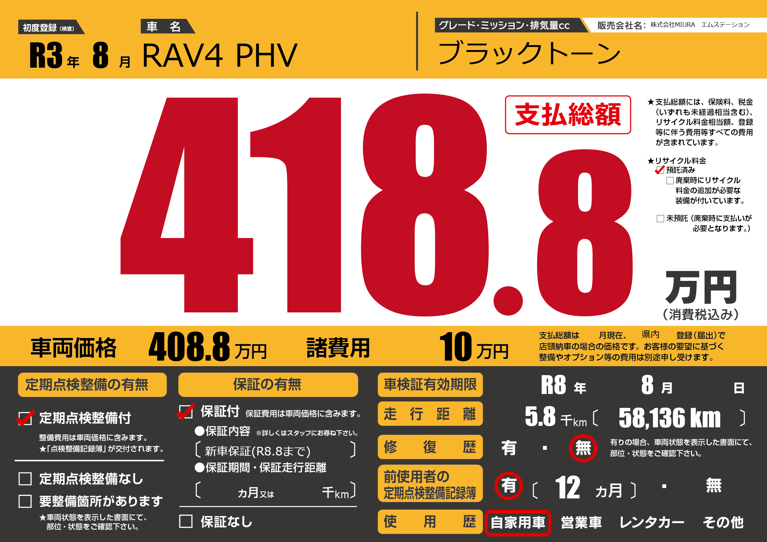 | 車名 | RAV4 PHV | グレード ミッション 排気量 |