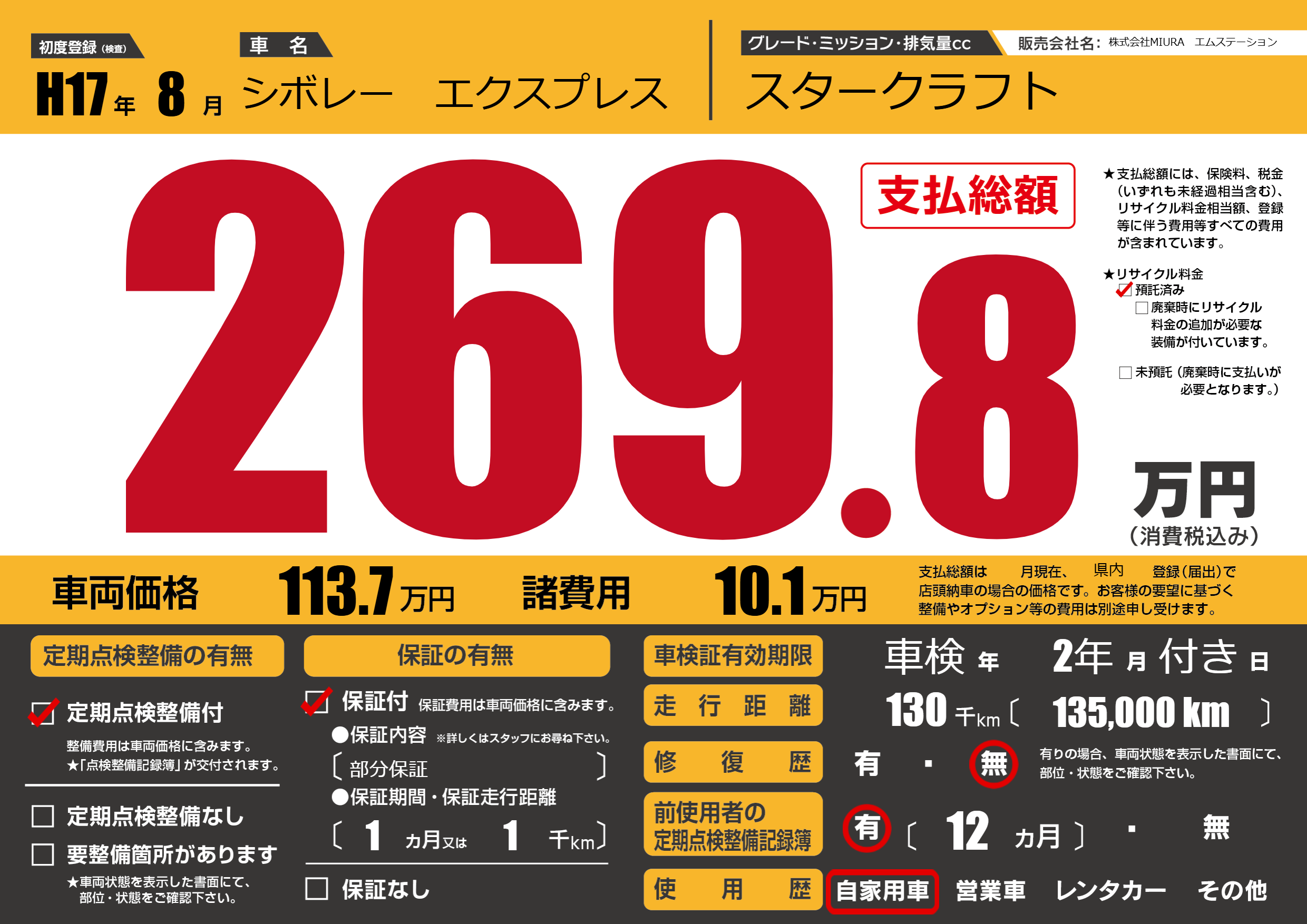 | 走行キロ | 13万km | 初年度登録 | H17年8月 |