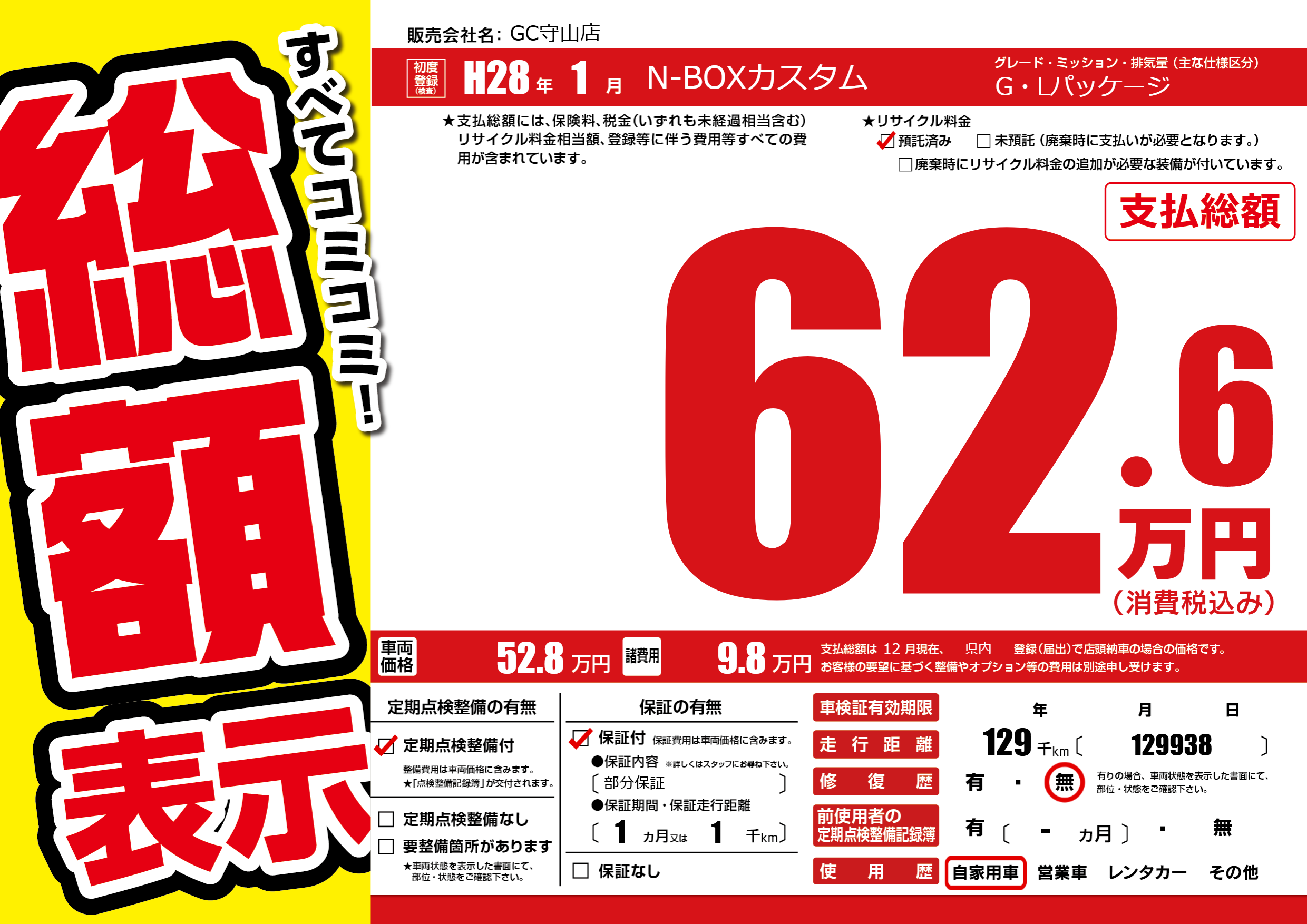 | 車名 | N-BOXカスタム | グレード ミッション 排気量 |