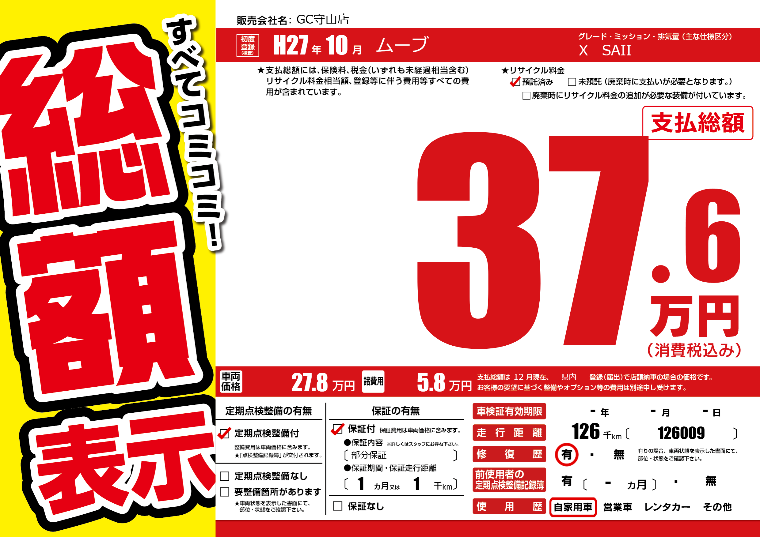 | 車名 | ムーブ | グレード ミッション 排気量 |