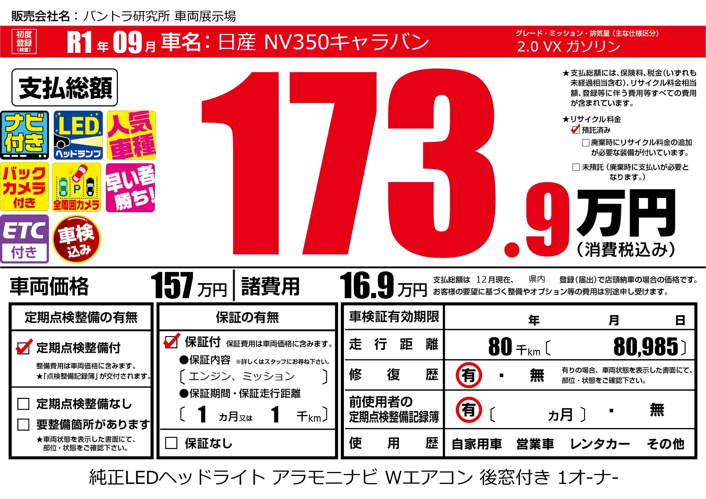 | 走行キロ | 8万km | 初年度登録 | R1年09月 |
