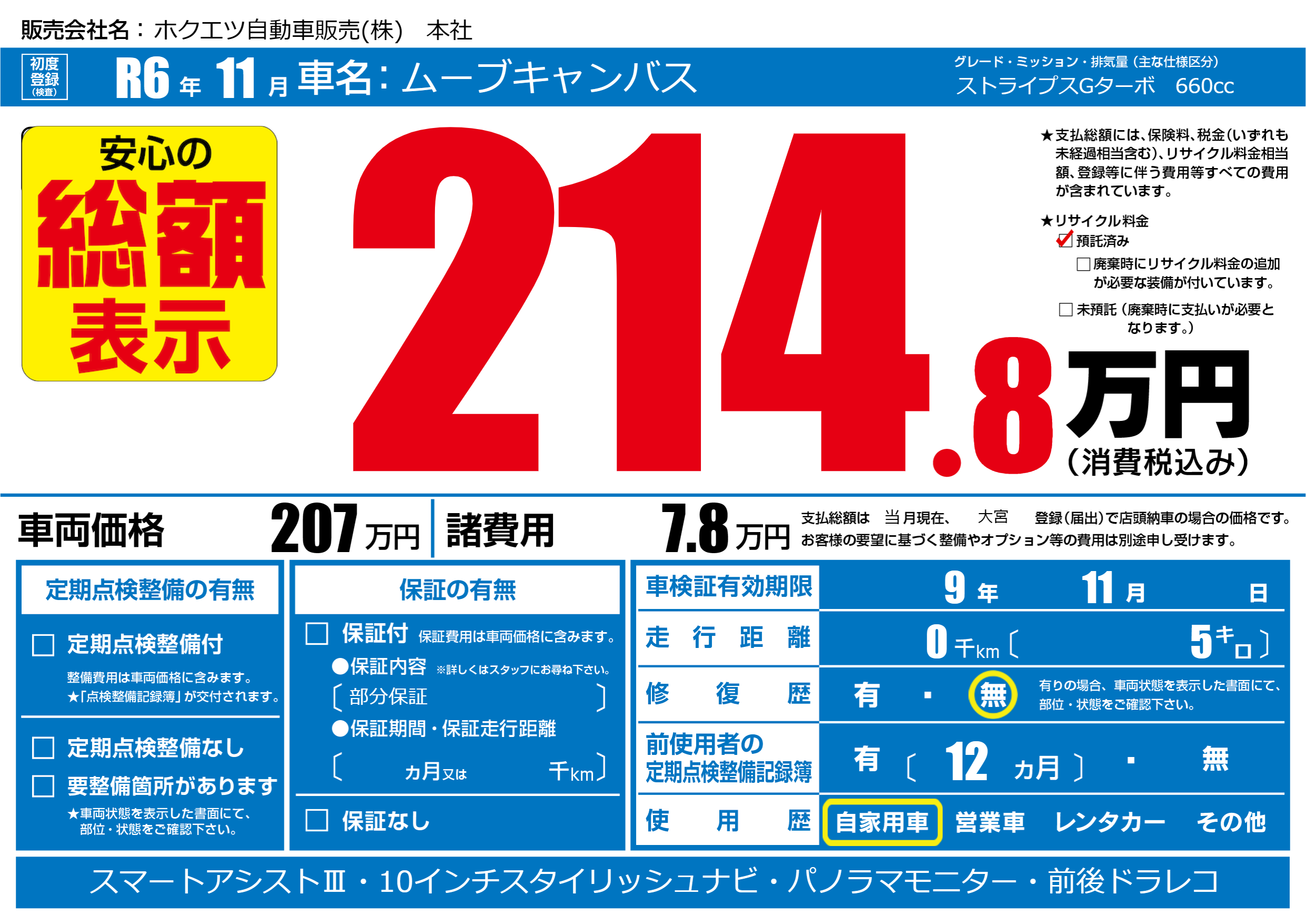 | 走行キロ | - | 初年度登録 | R6年11月 |