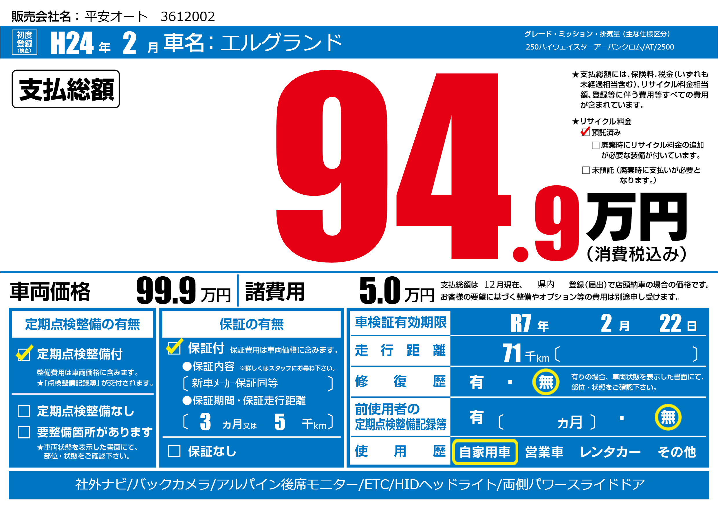 | 走行キロ | 7.1万km | 初年度登録 | H24年2月 |