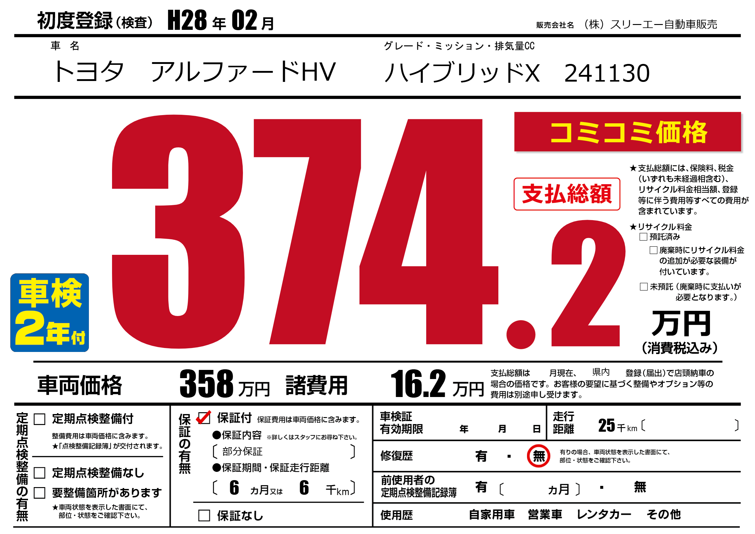 | 車名 | トヨタ アルファードHV | グレード ミッション 排気量 |