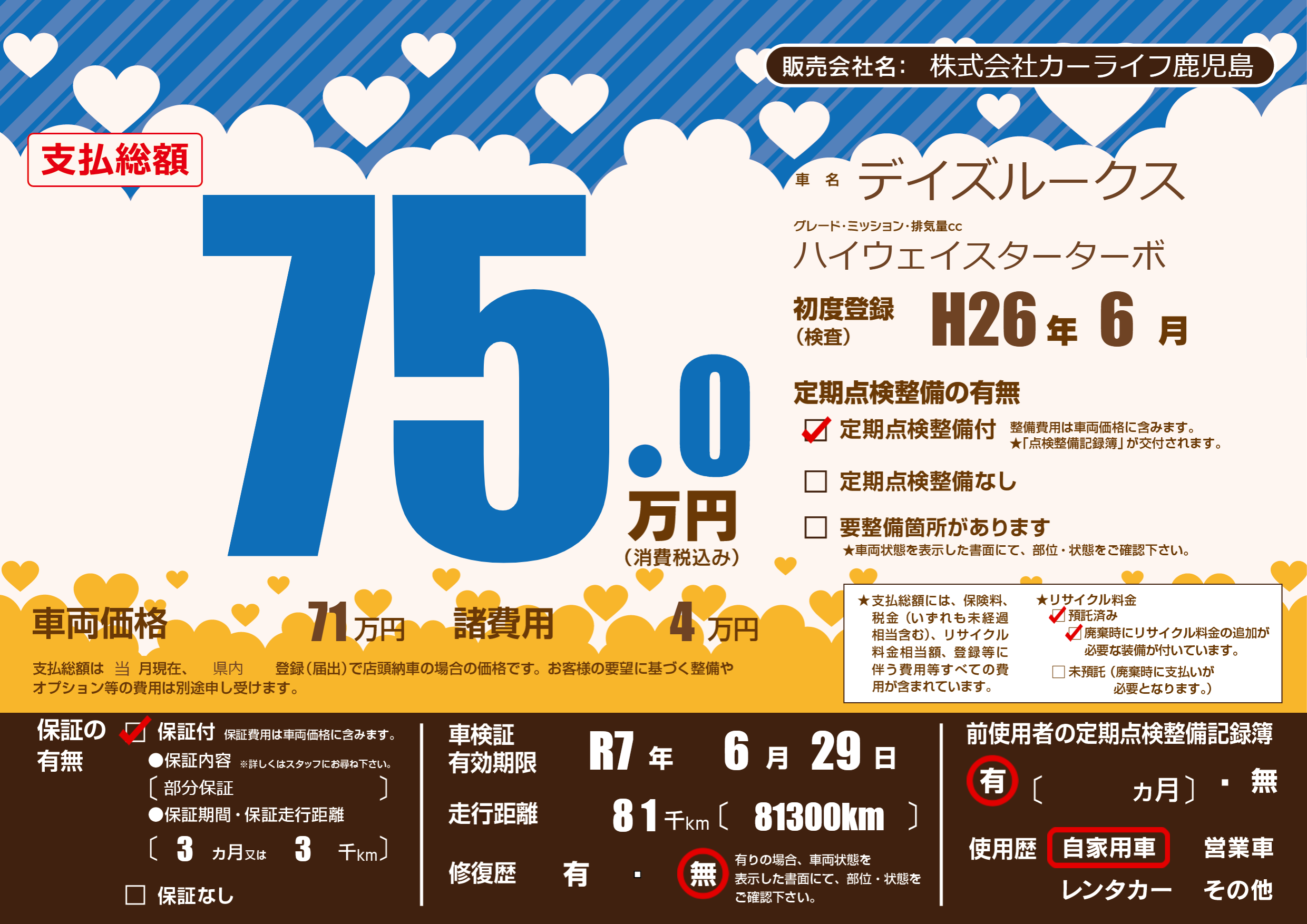 | 走行キロ | 0.8万km | 初年度登録 | H26年6月 |