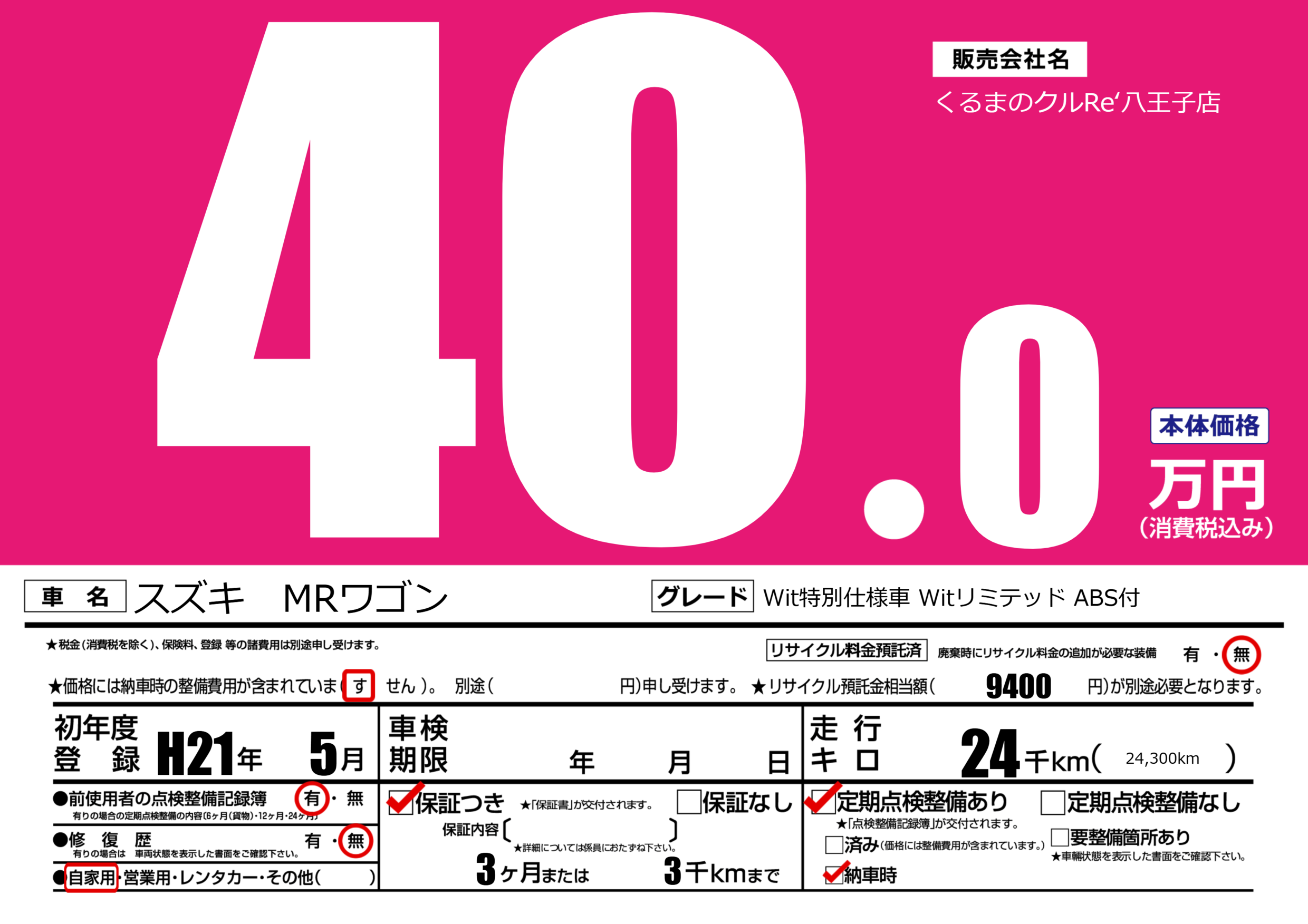 なし | リサイクル預託金相当額 | ( 9400円)が別途必要 |