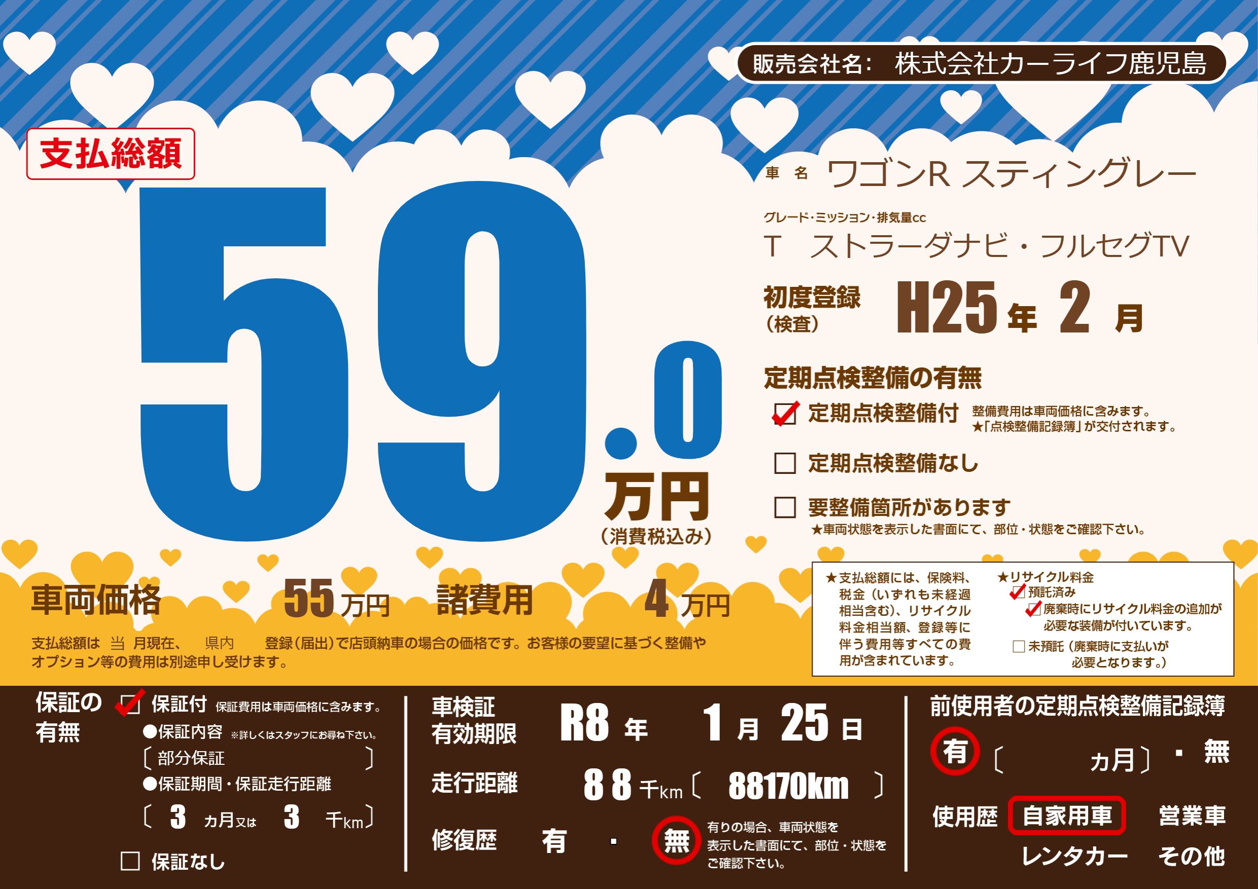 | 車名 | ワゴンR スティングレー | グレード ミッション 排気量 |