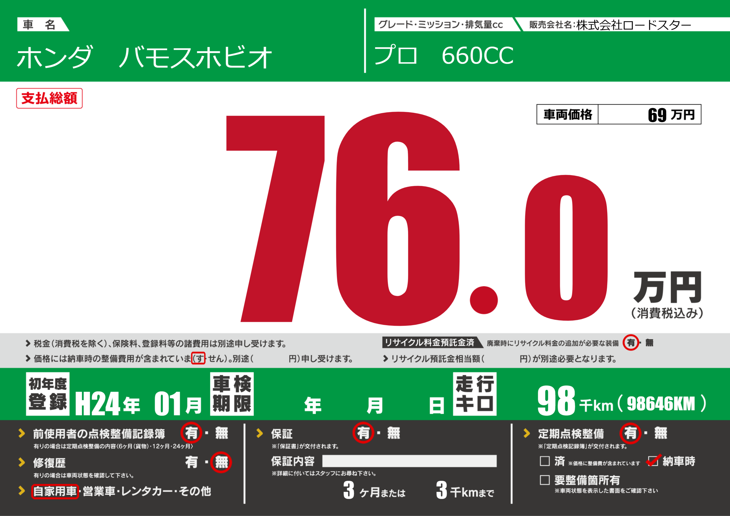| 定期点検整備 | 定期点検整備あり 納車時あり | ||
