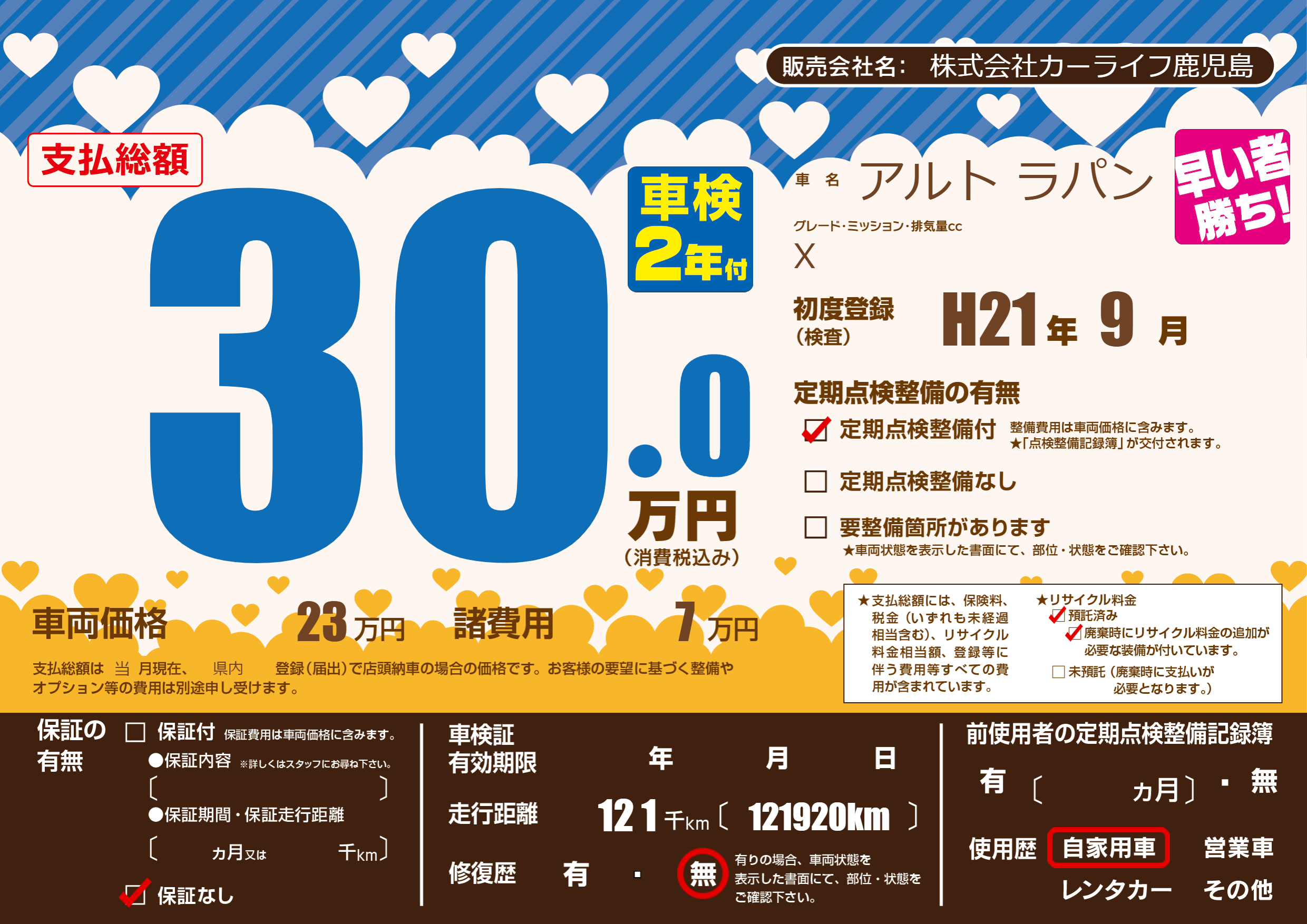 | 車名 | アルト ラパン | グレード ミッション 排気量 |
