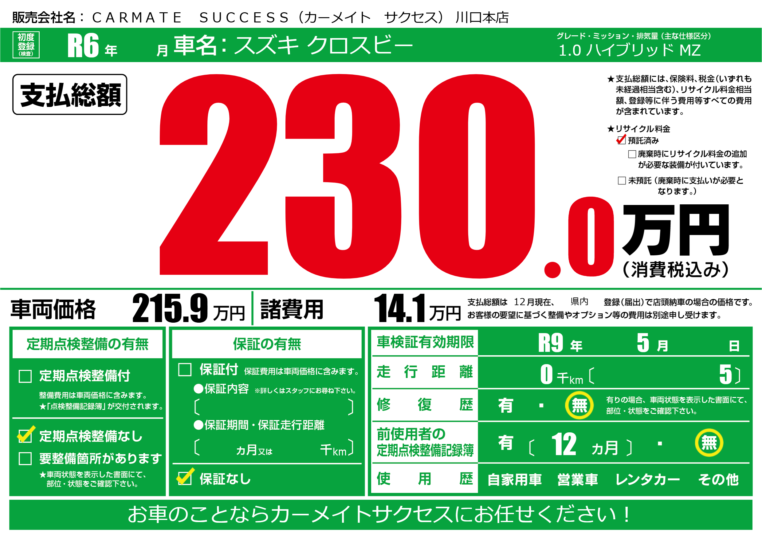 | 走行キロ | - | 初年度登録 | R6年---月 |