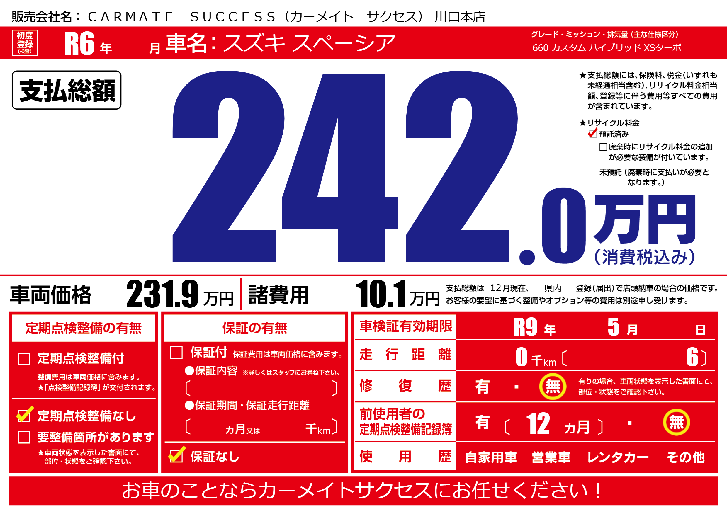 | 走行キロ | - | 初年度登録 | R6年---月 |