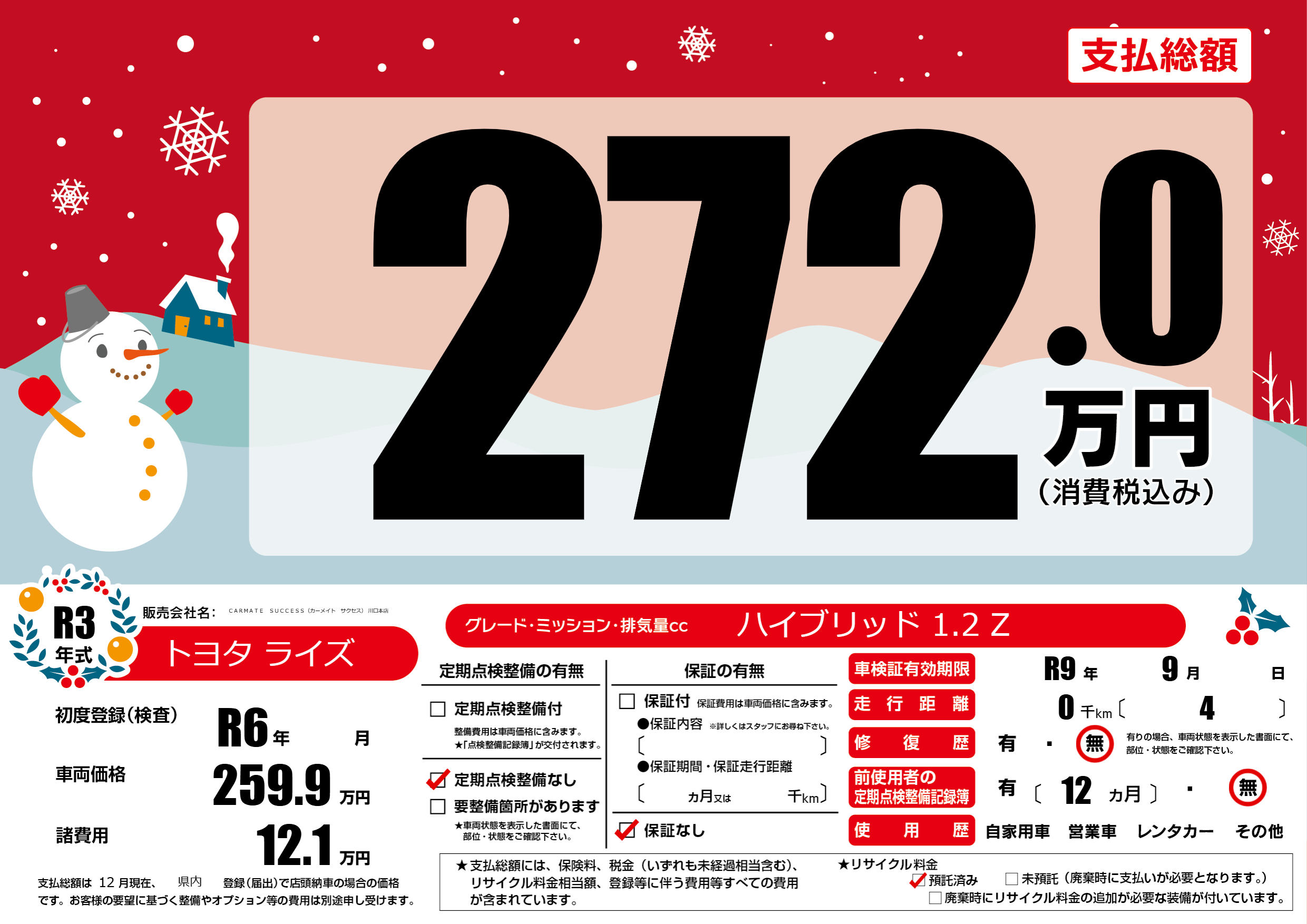 | 車名 | トヨタ ライズ | グレード ミッション 排気量 |