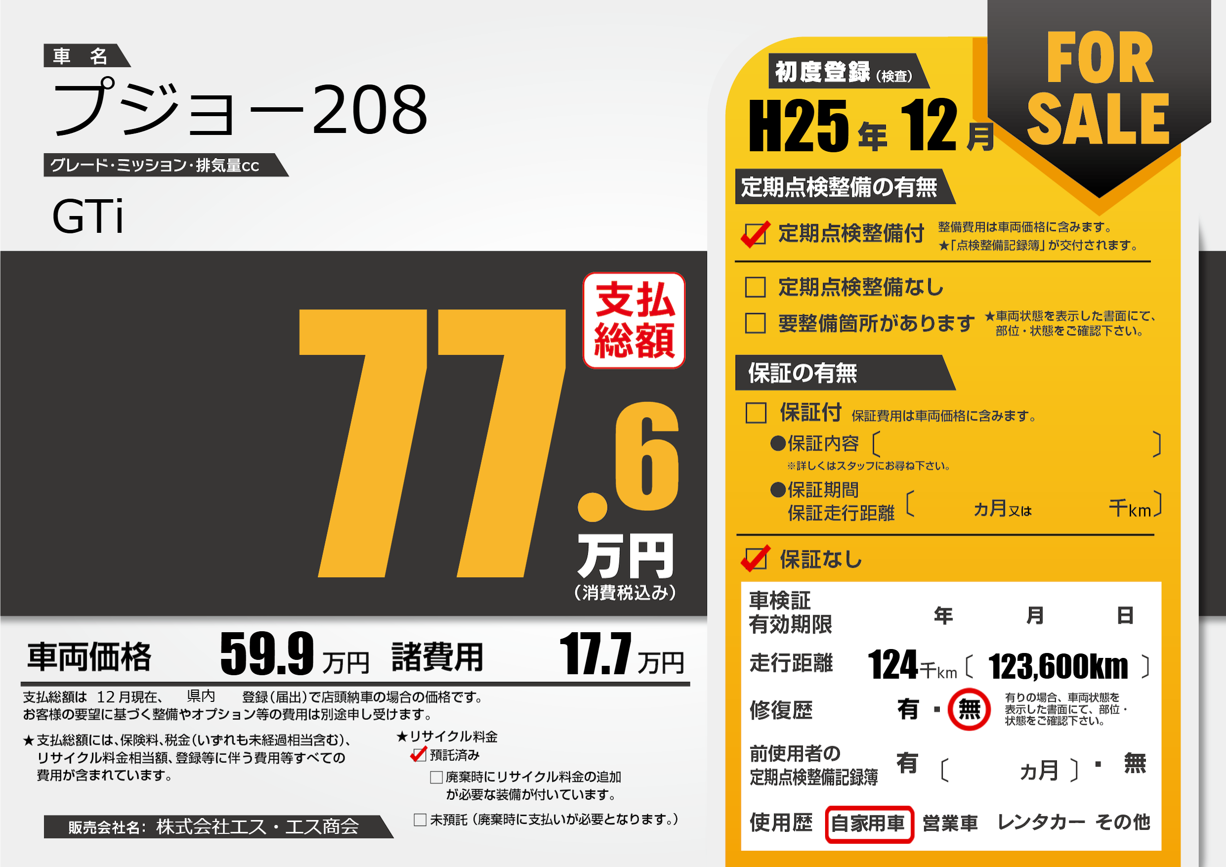 | 車名 | プジョー208 | グレード ミッション 排気量 |