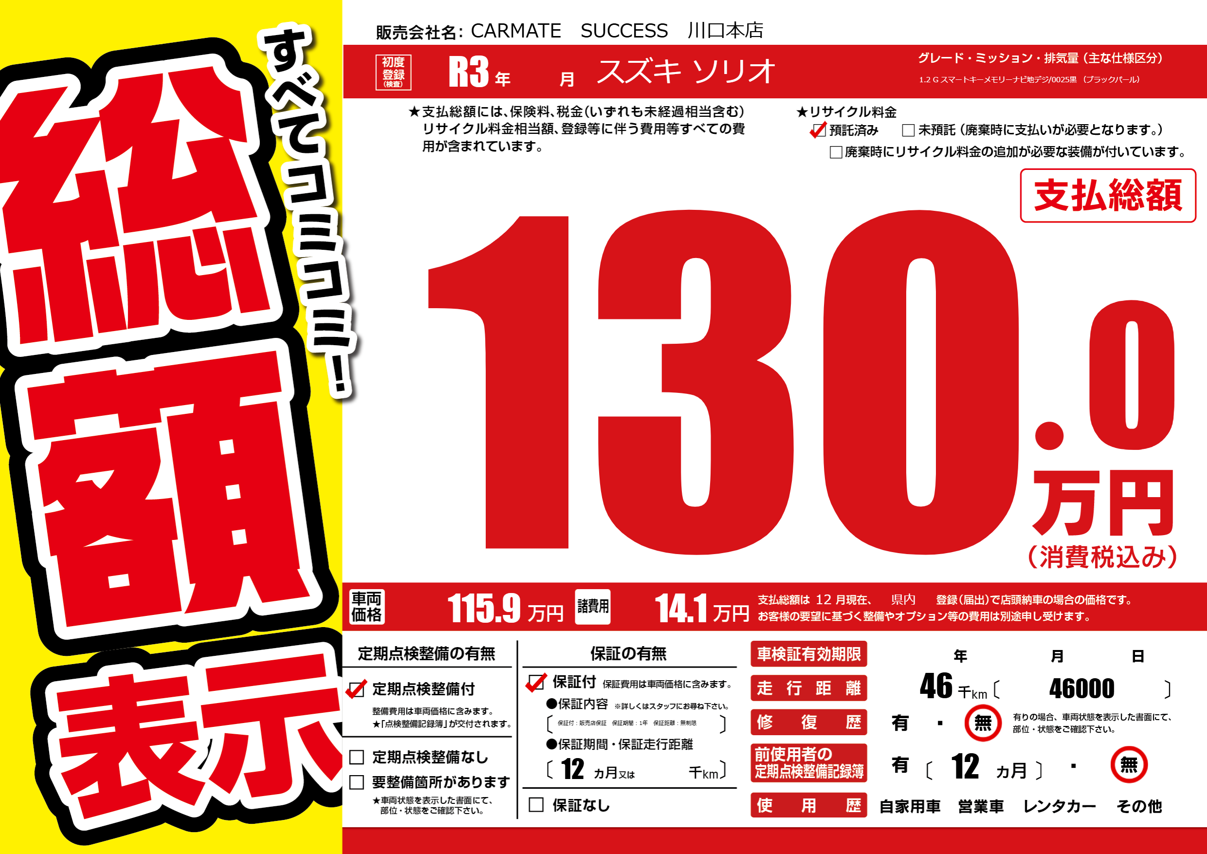 | 車名 | スズキ ソリオ | グレード ミッション 排気量 |