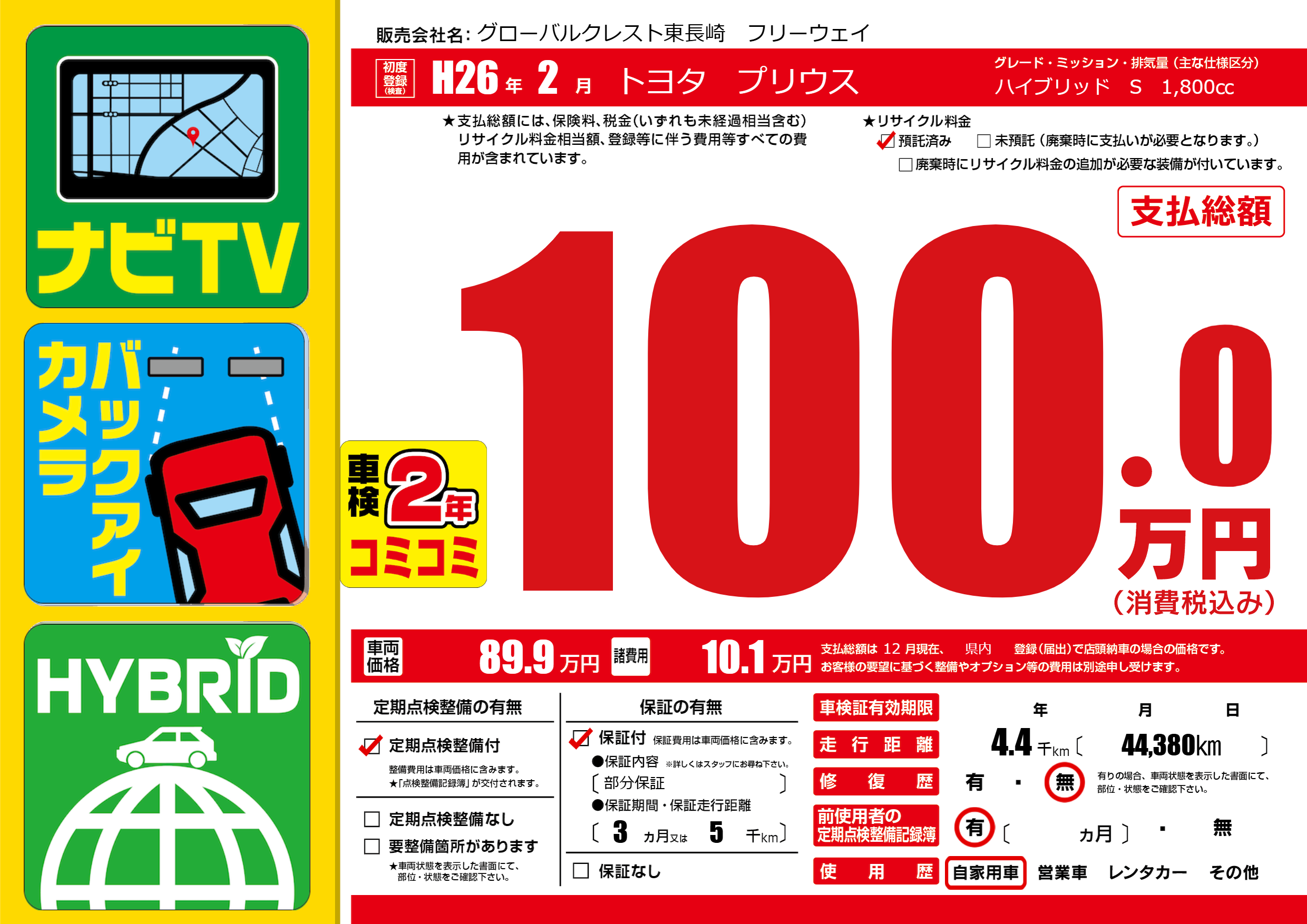 | 車名 | トヨタ プリウス | グレード ミッション 排気量 |
