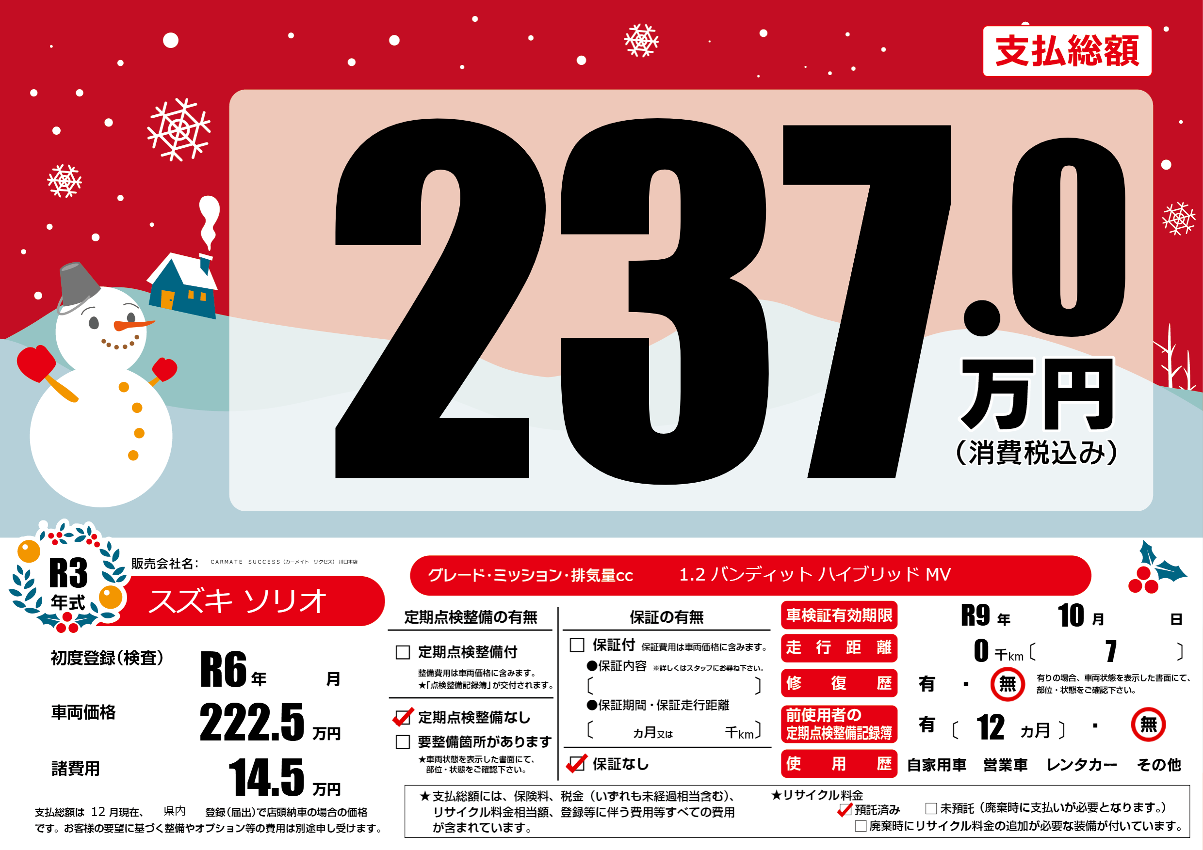 | 車検制限 | R9年 10月 - 日 | ||