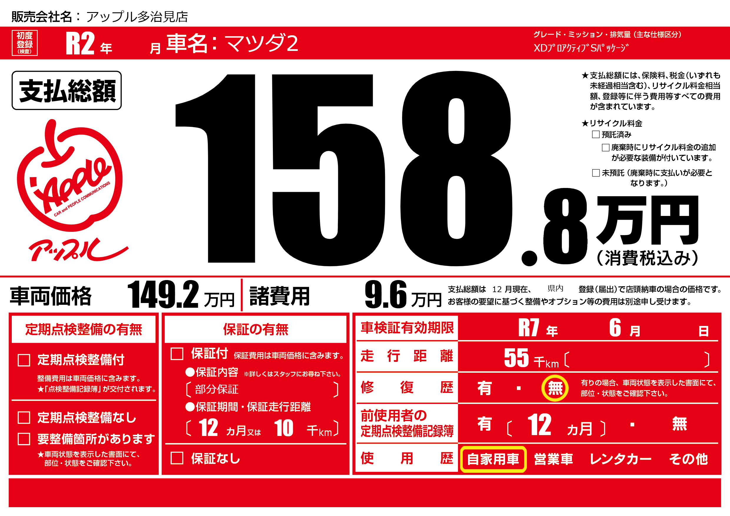 | 車名 | マツダ2 | グレード ミッション 排気量 |