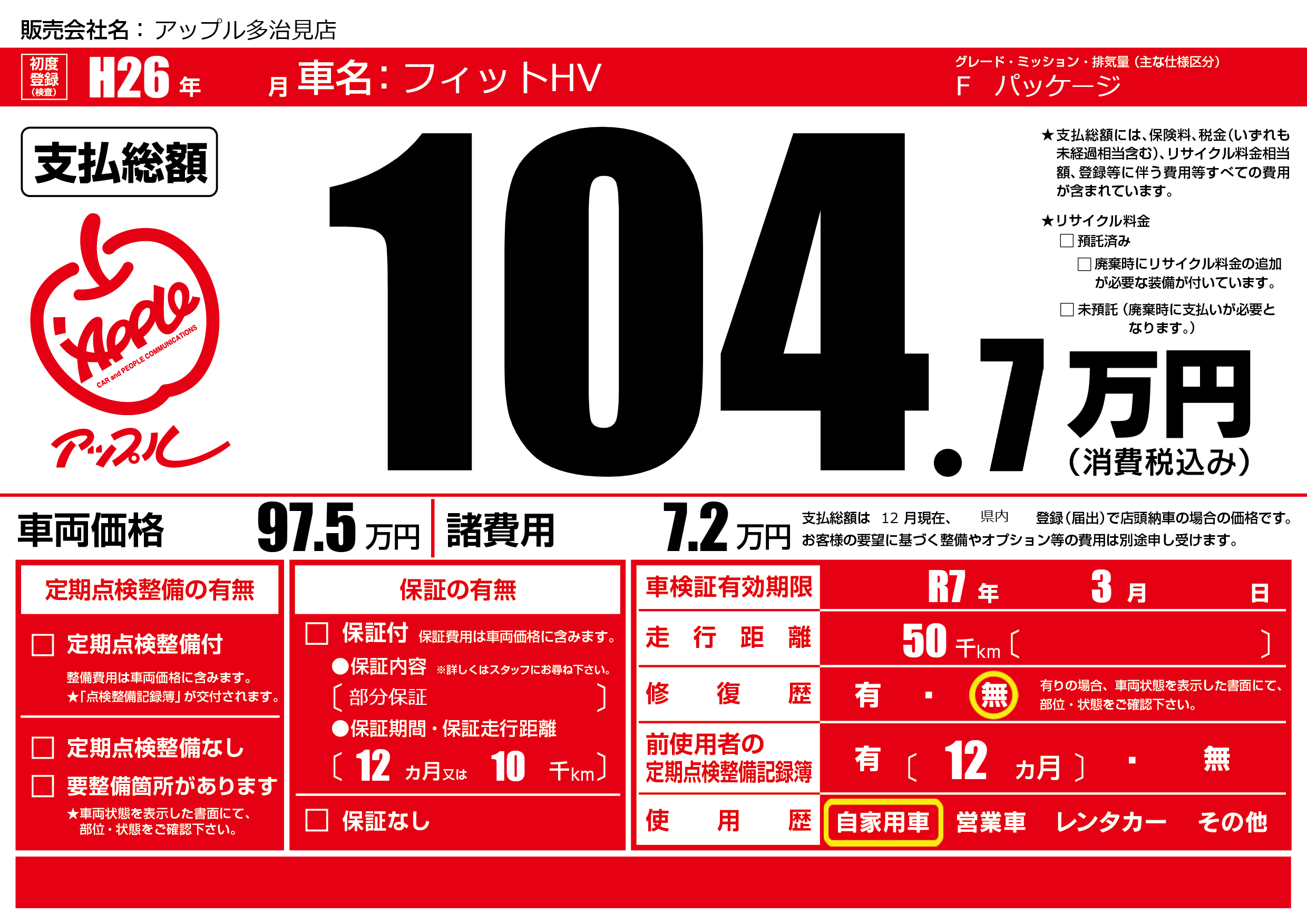 | 走行キロ | 5万km | 初年度登録 | H26年---月 |