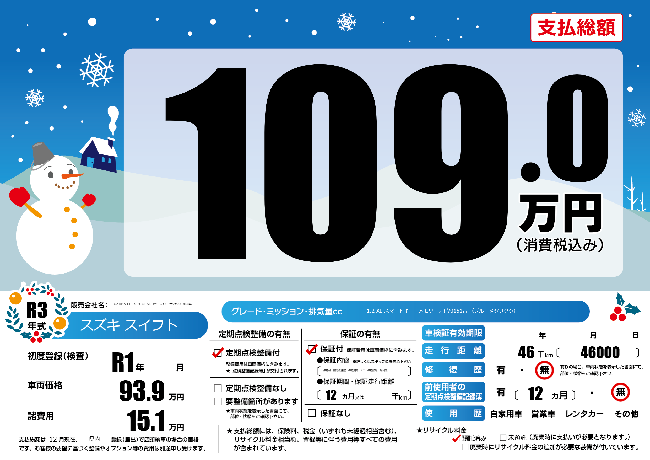 保証なし 保証内容(保証付:販売店保証 保証期間:1年 保証距離:無制限) 12ヶ月または()千kmまで |