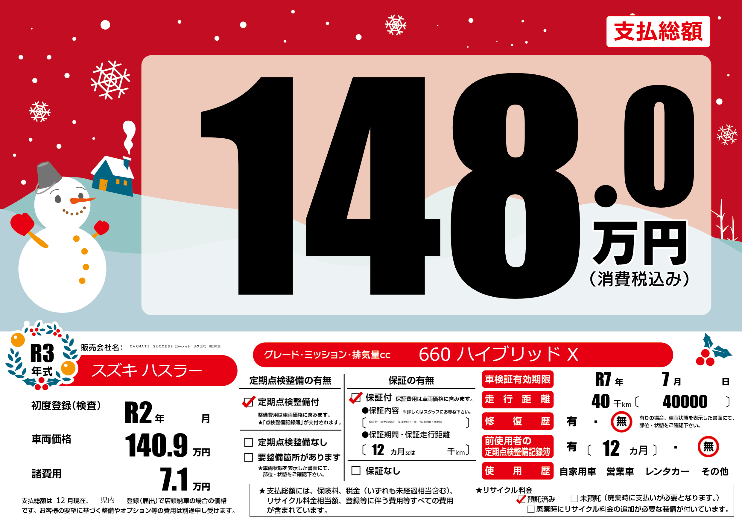 | 車名 | スズキ ハスラー | グレード ミッション 排気量 |