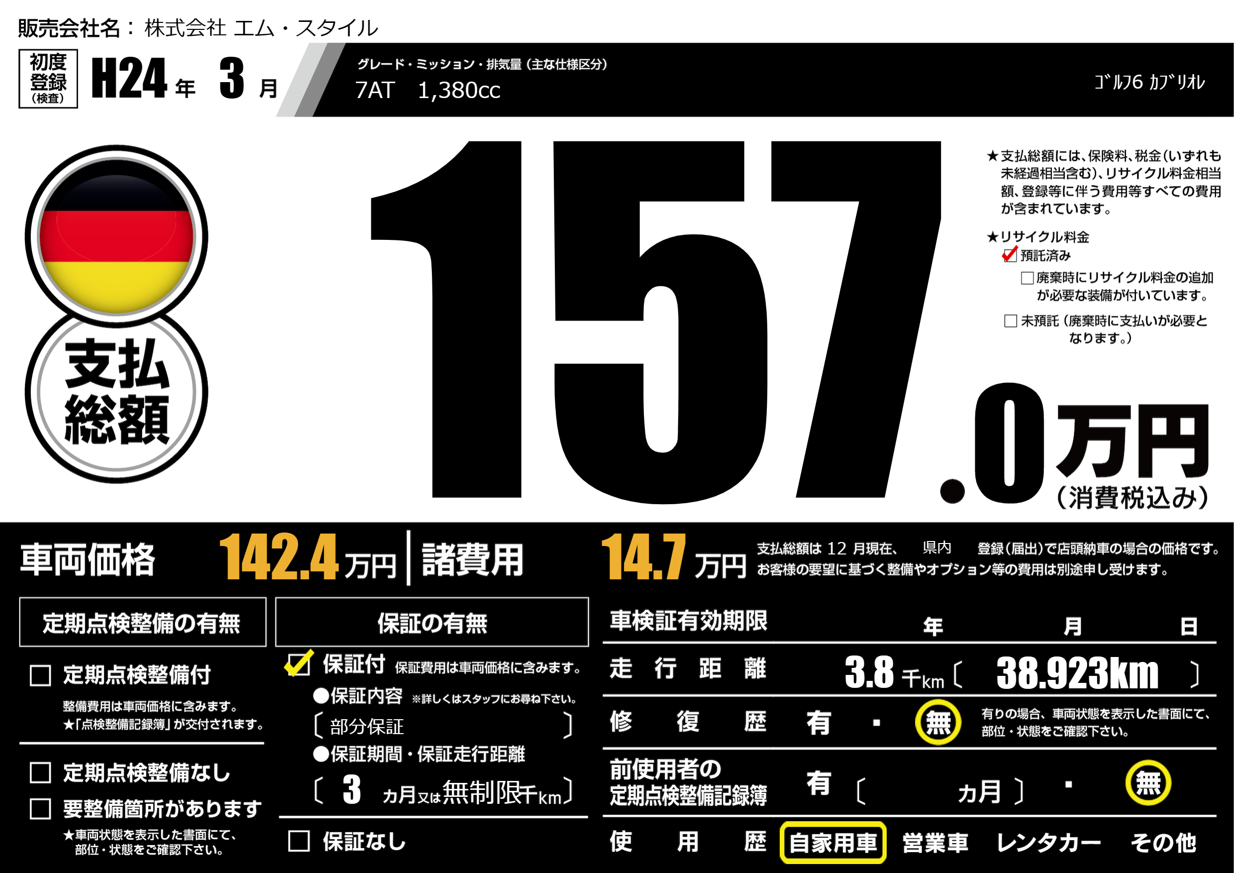 | 走行キロ | 0.3万km | 初年度登録 | H24年3月 |