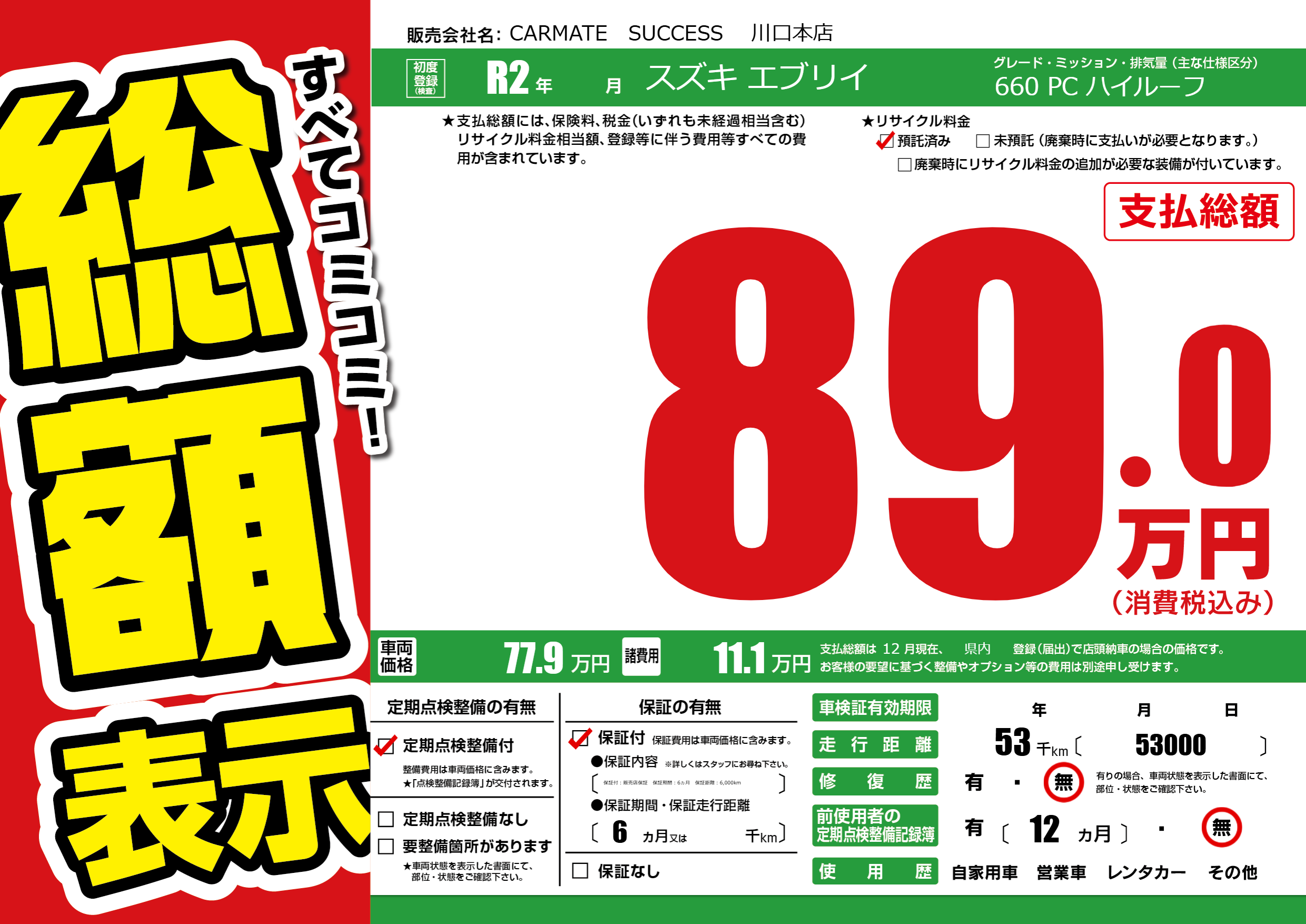 | 車名 | スズキ エブリイ | グレード ミッション 排気量 |