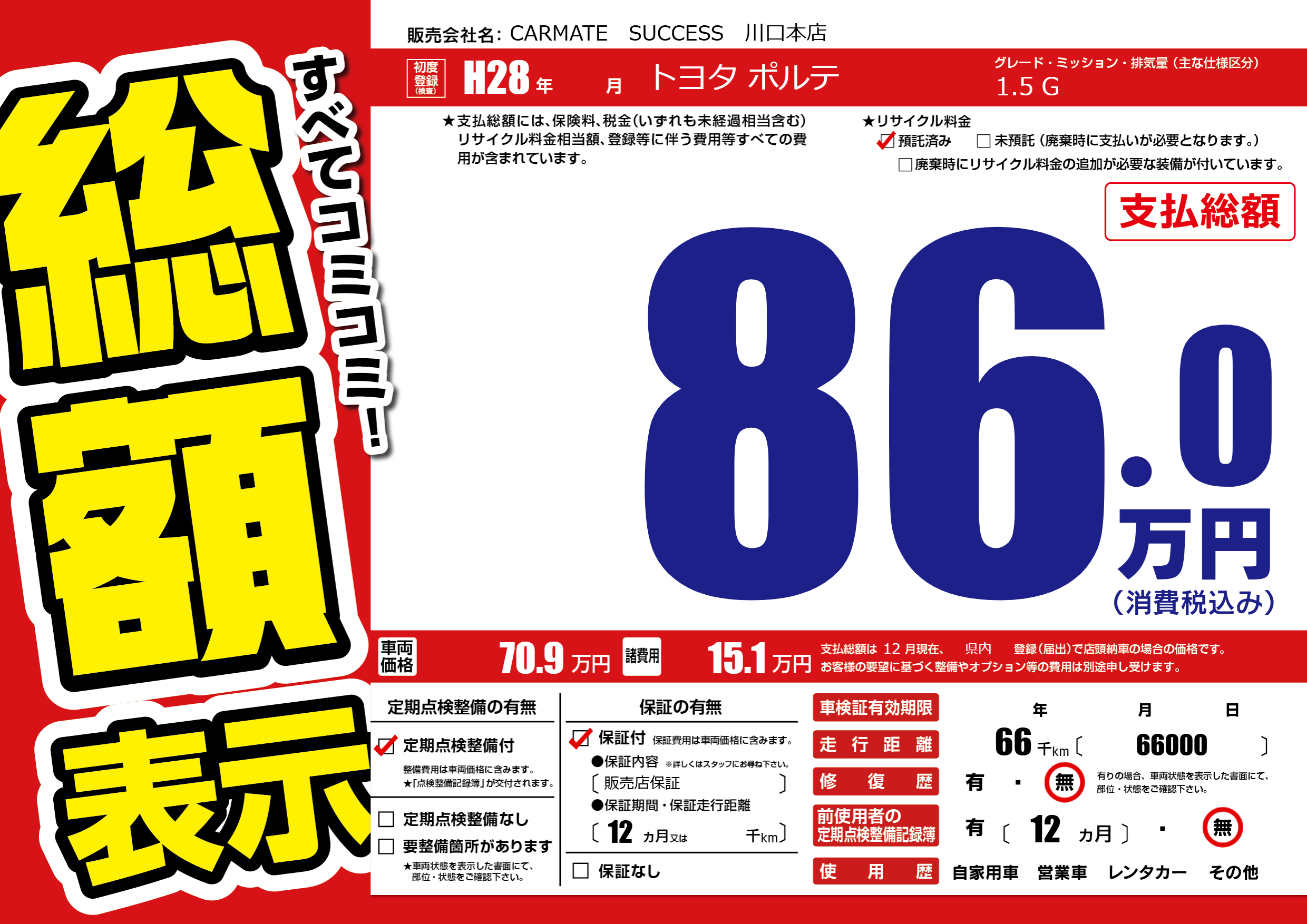 | 車名 | トヨタ ポルテ | グレード ミッション 排気量 |