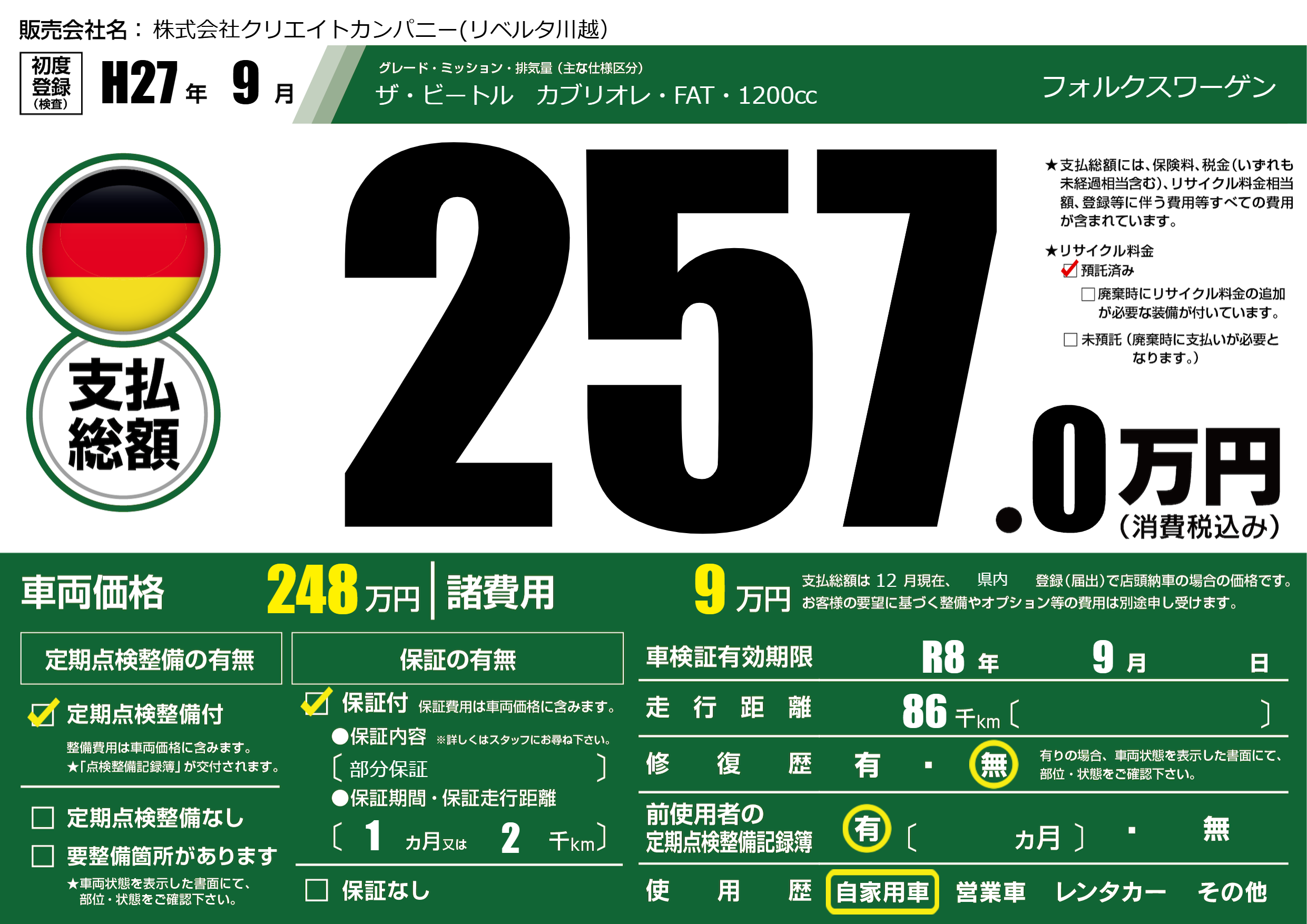| 車名 | フォルクスワーゲン | グレード ミッション 排気量 |
