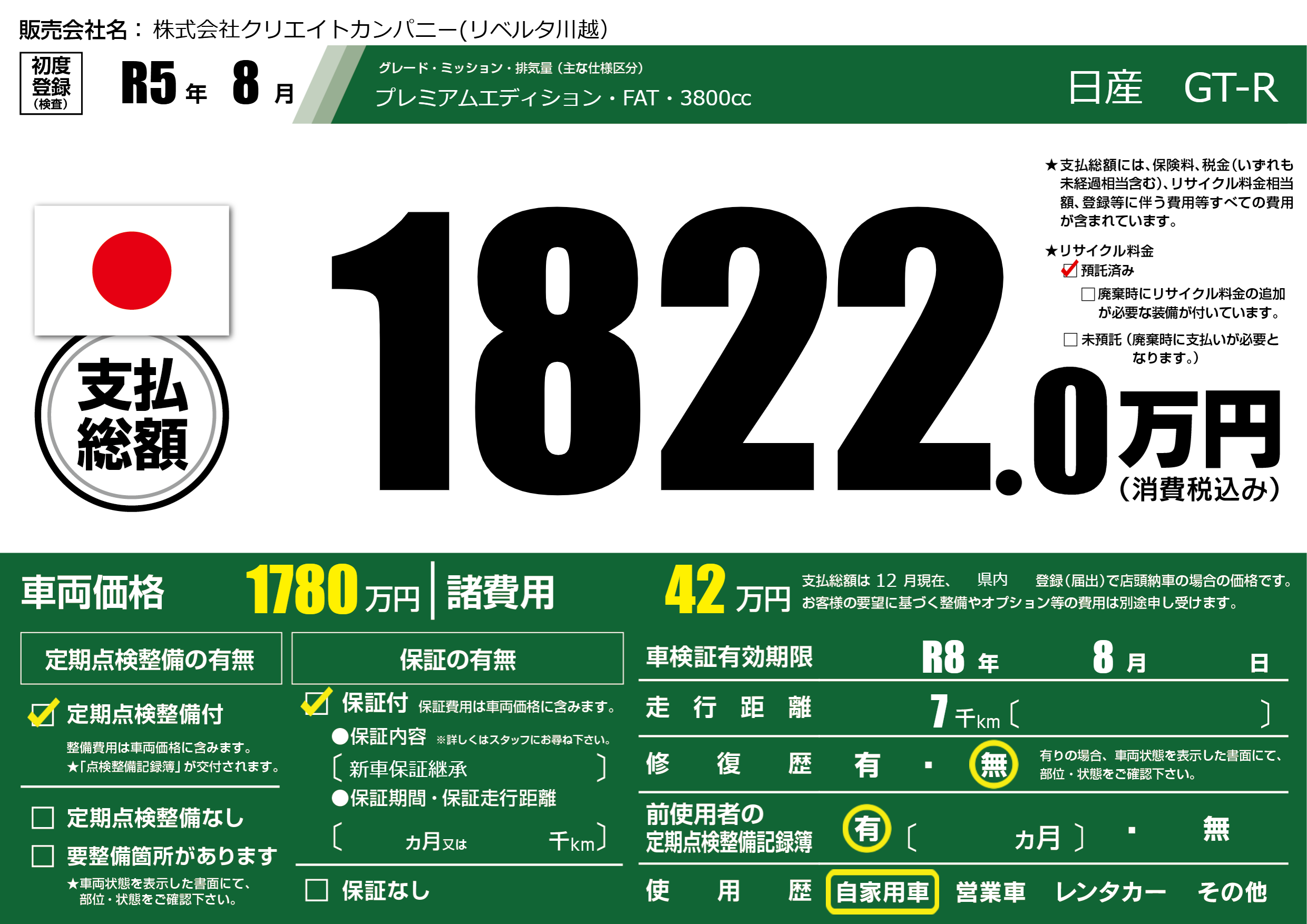| 車名 | 日産 GT-R | グレード ミッション 排気量 |
