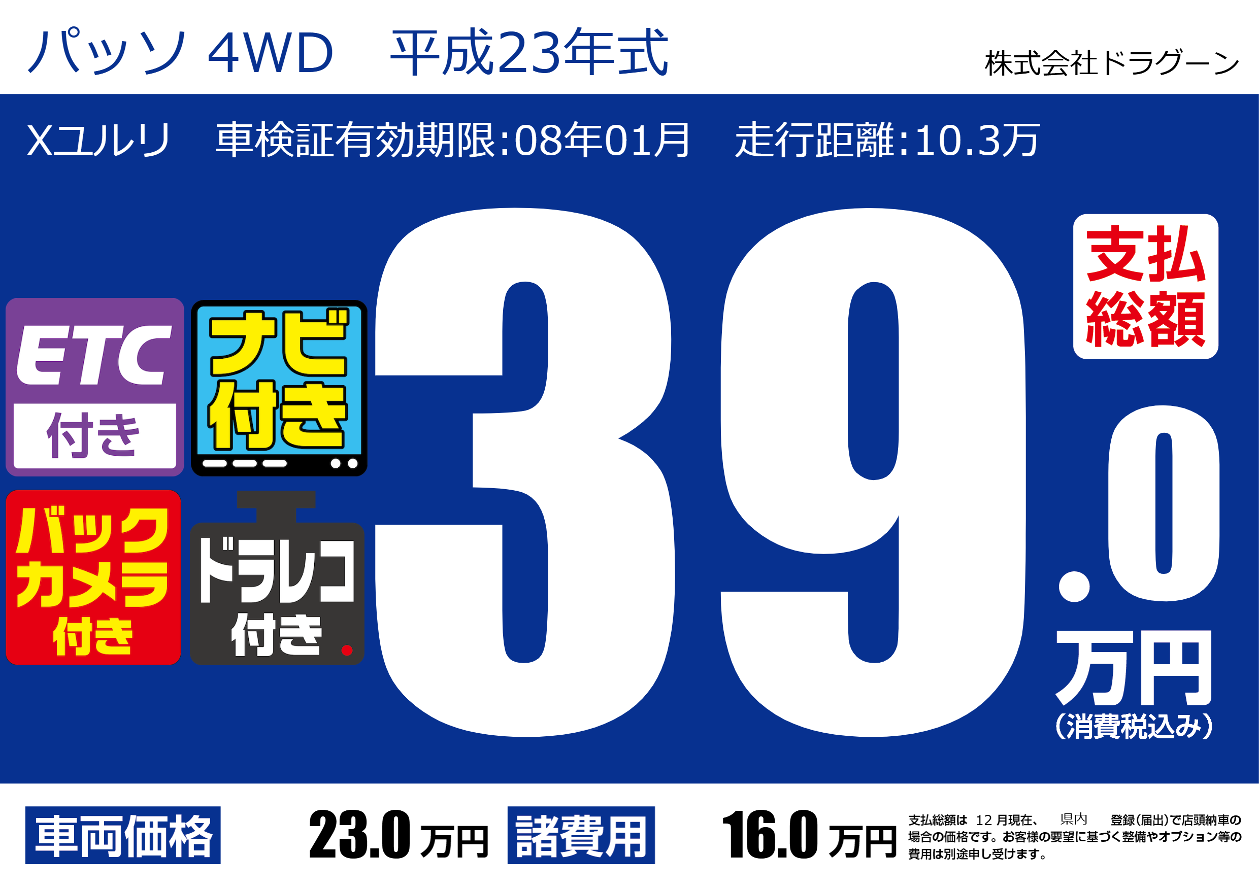 | 車名 | パッソ 4WD 平成23年式 | グレード ミッション 排気量 |