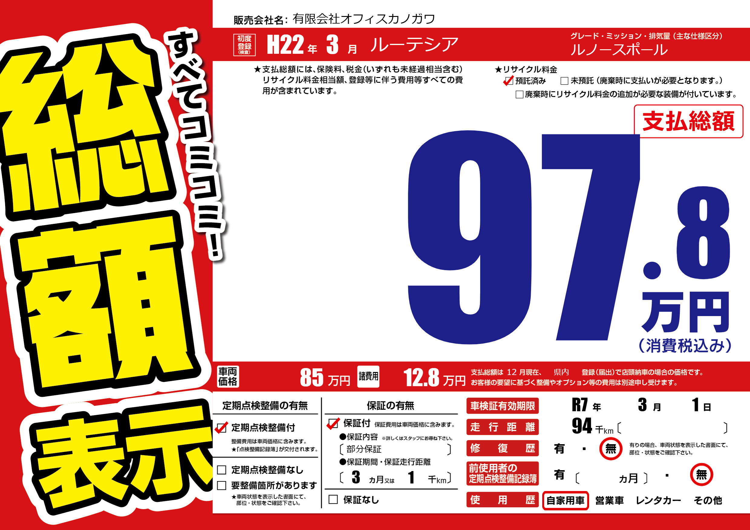 | 車名 | ルーテシア | グレード ミッション 排気量 |