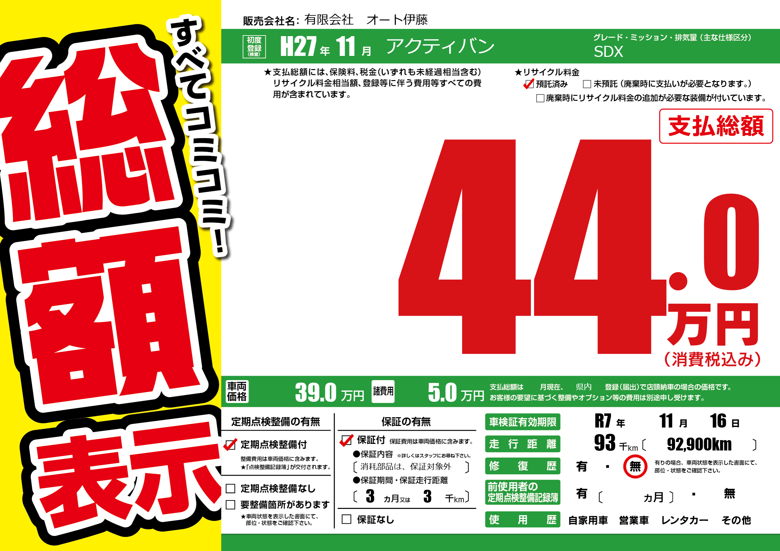 | 車名 | アクティバン | グレード ミッション 排気量 |