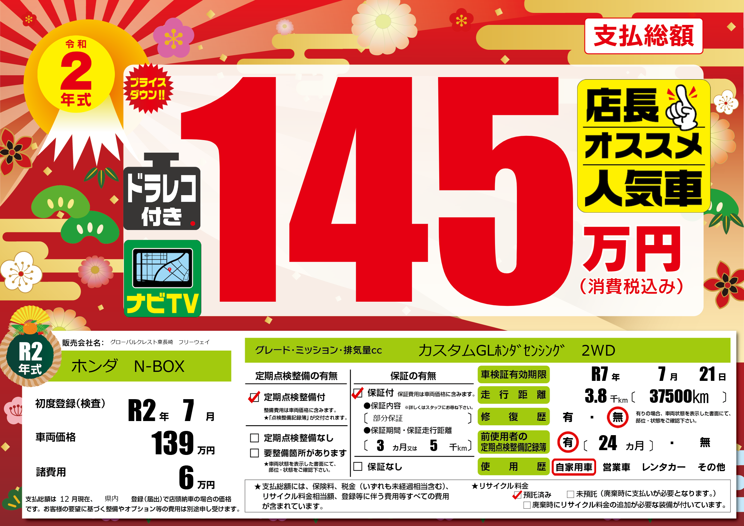 | 走行キロ | 0.3万km | 初年度登録 | R2年7月 |