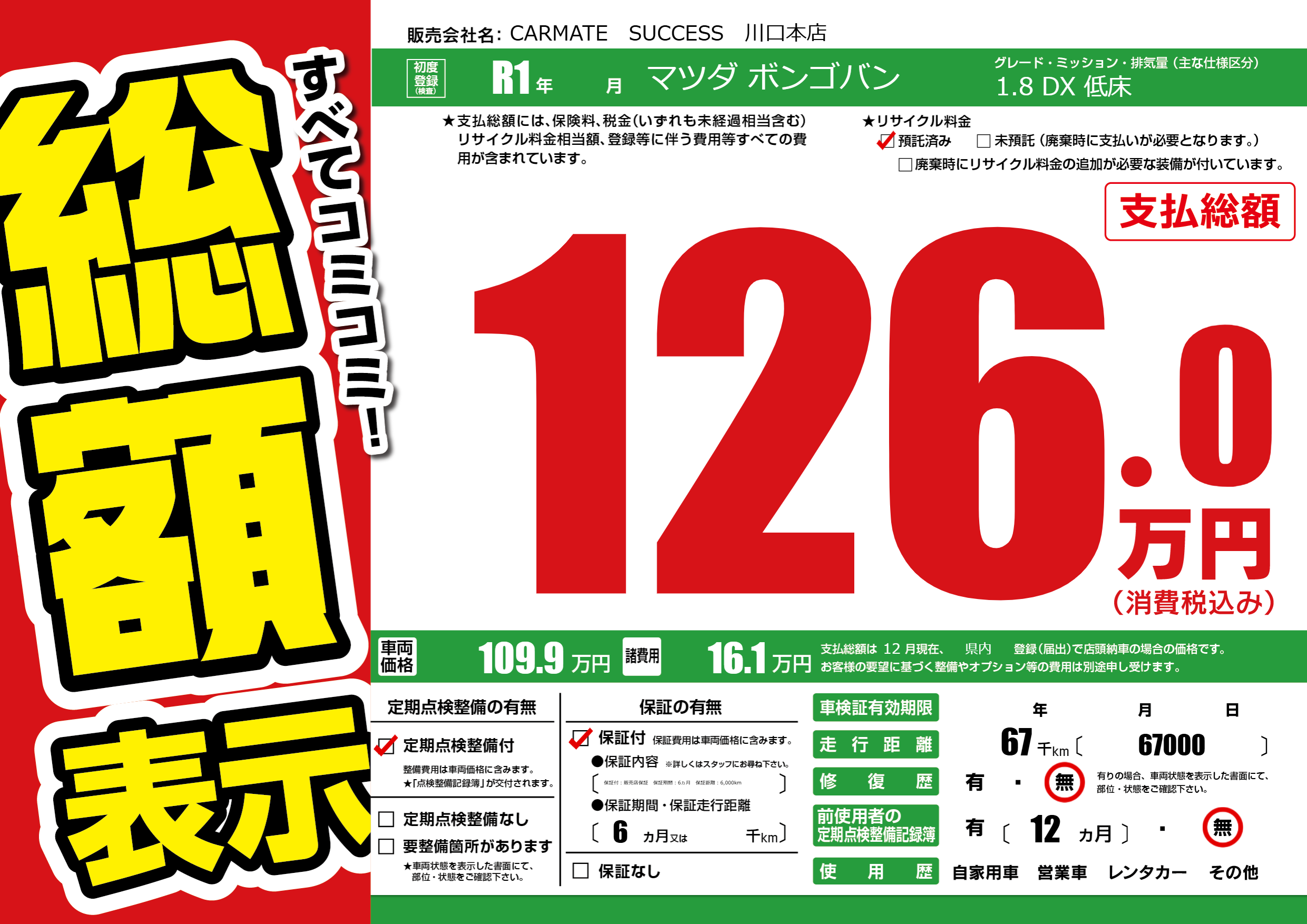 保証なし 保証内容(保証付:販売店保証 保証期間:6ヵ月 保証距離:6,000km) 6ヶ月または()千kmまで |