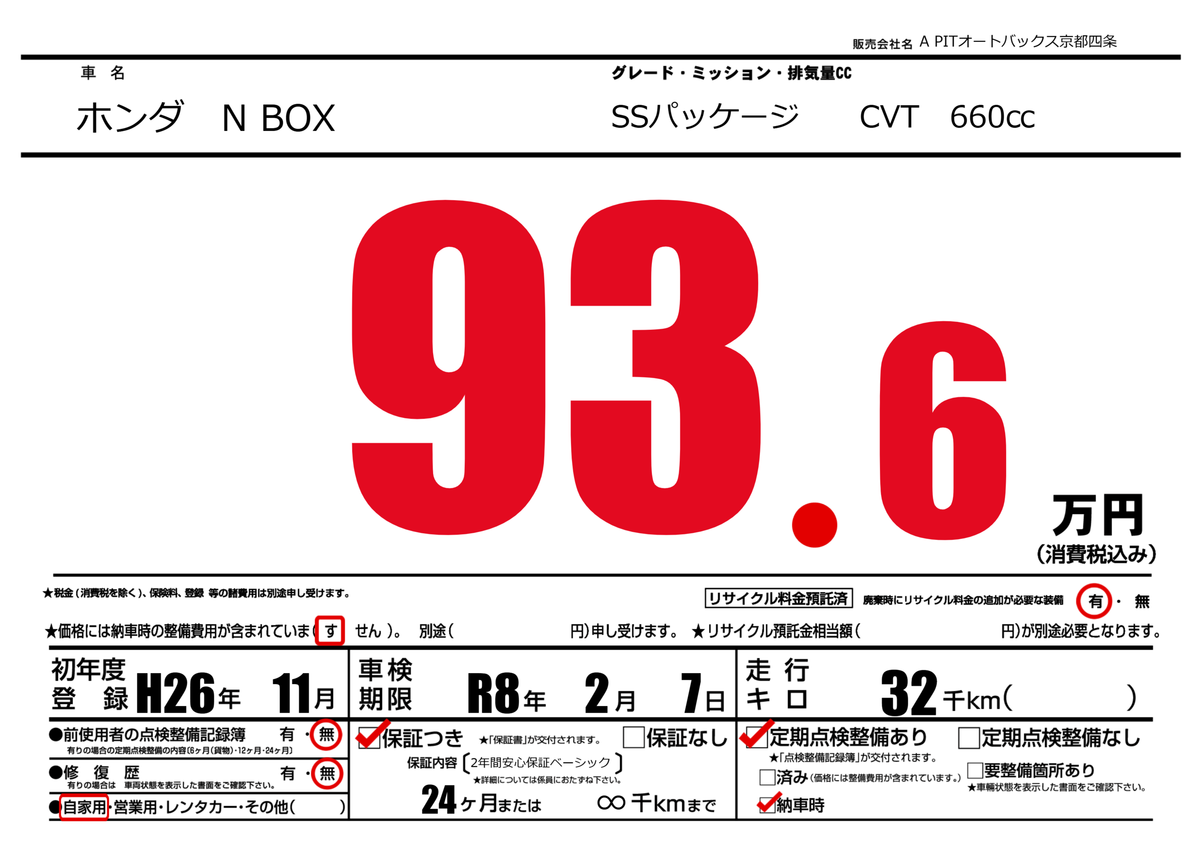 | 車名 | ホンダ N BOX | グレード ミッション 排気量 |