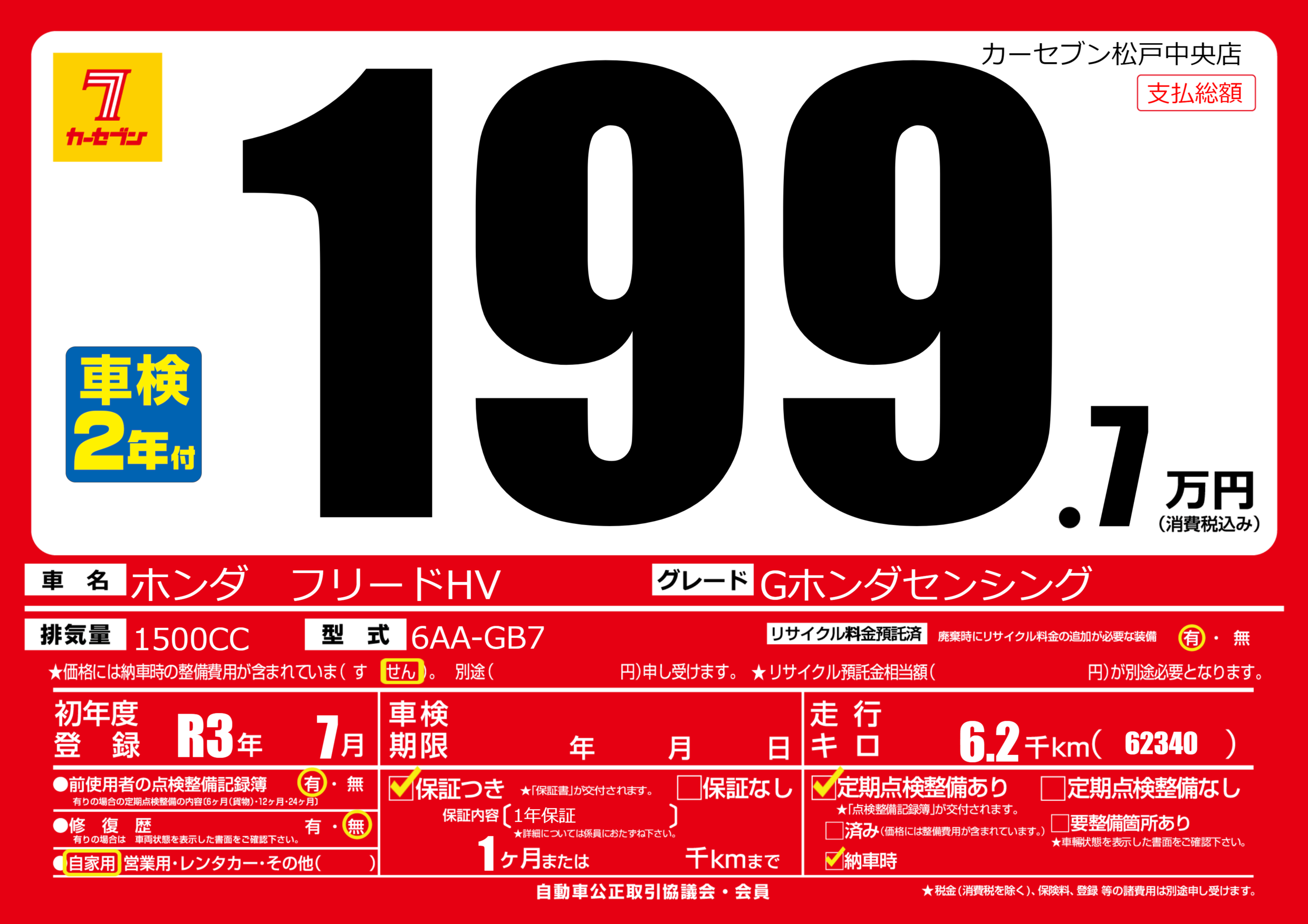 | 車名 | ホンダ フリードHV | グレード ミッション 排気量 |
