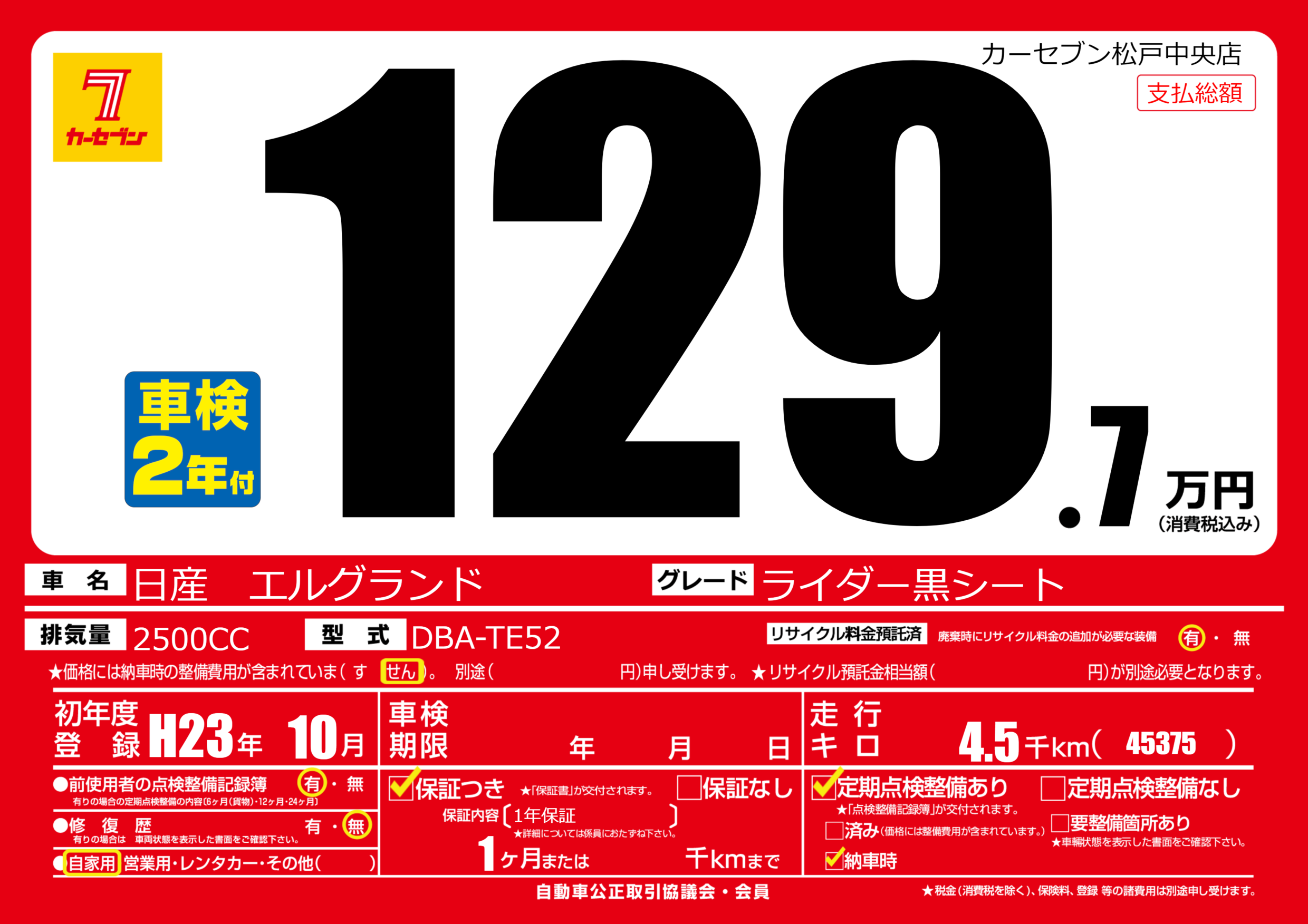 | 走行キロ | 0.4万km | 初年度登録 | H23年10月 |