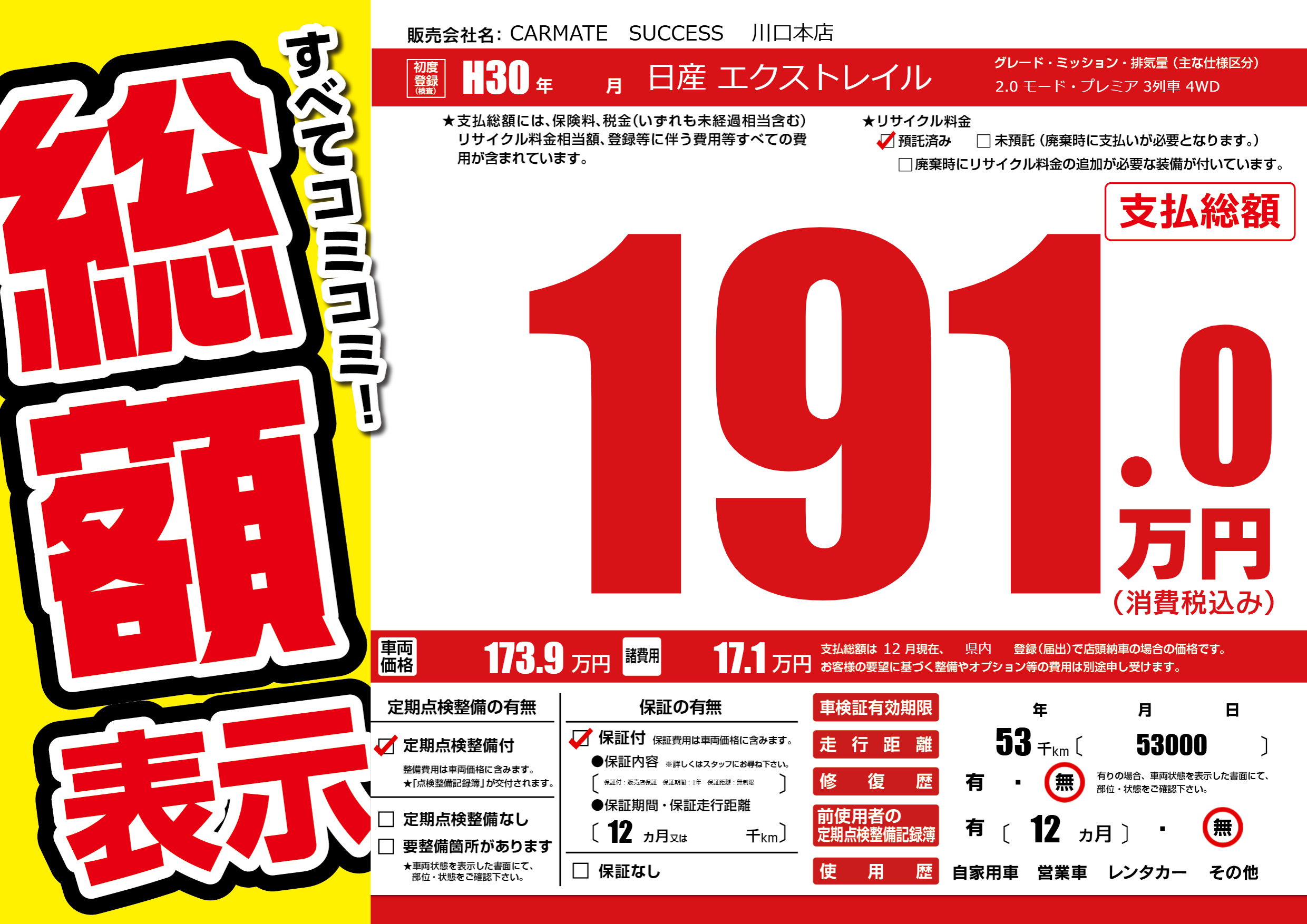 保証なし 保証内容(保証付:販売店保証 保証期間:1年 保証距離:無制限) 12ヶ月または()千kmまで |