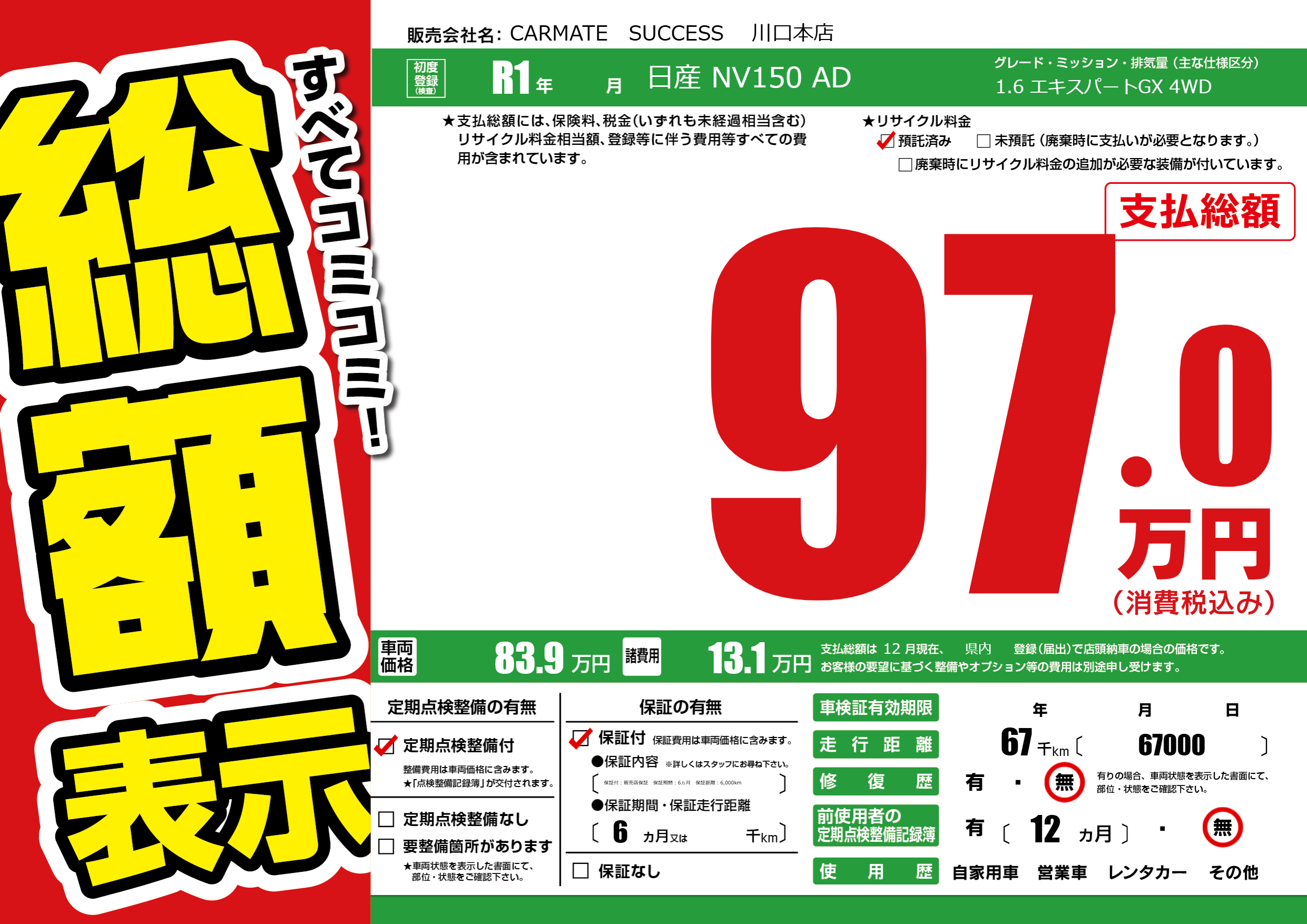 | 車名 | 日産 NV150 AD | グレード ミッション 排気量 |
